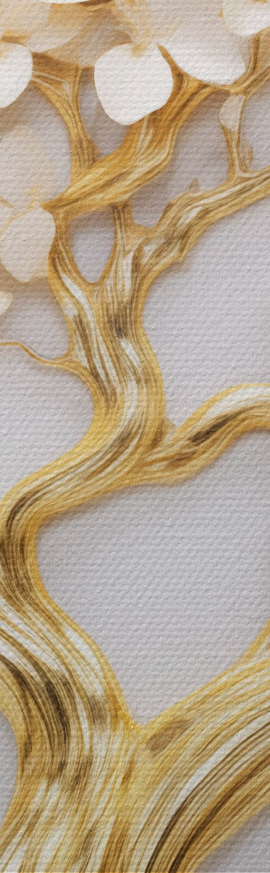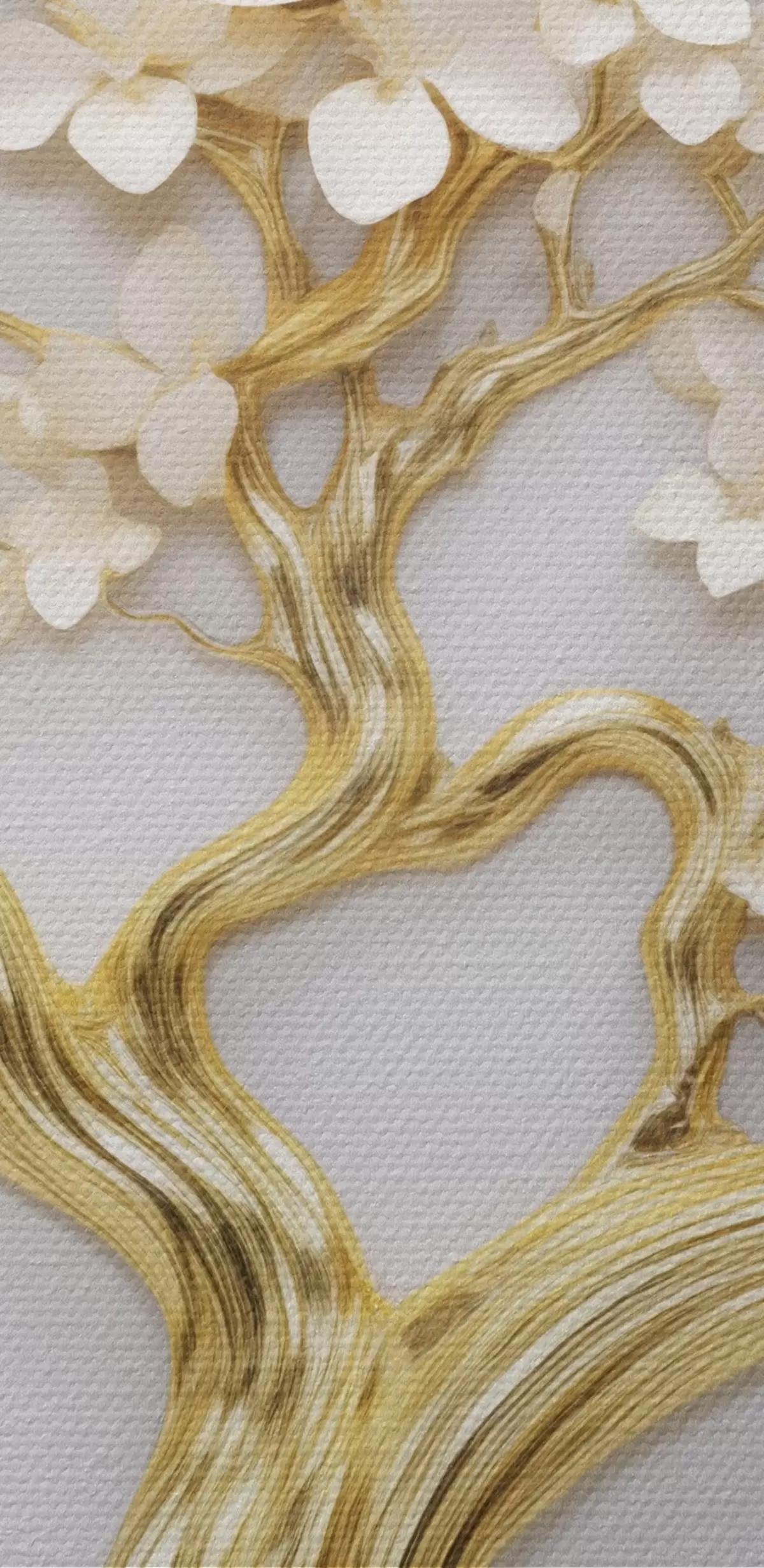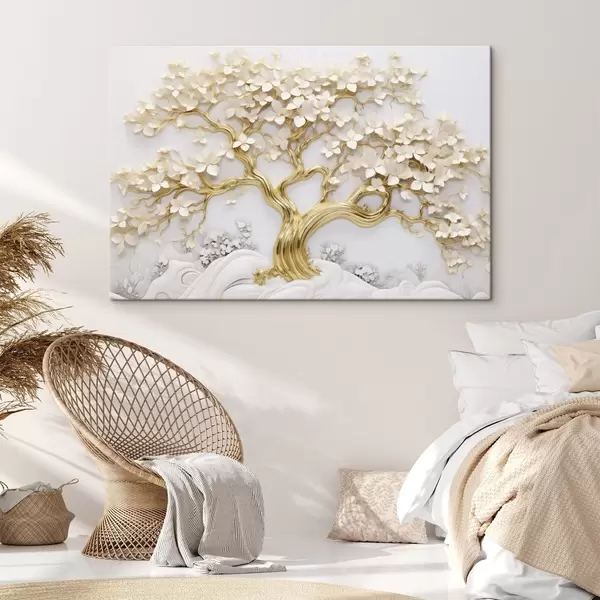 Schilderij Decoratieve boom met witte bloemen, witte achtergrond, witte rotsen, ingewikkelde details, op de natuur geïnspireerde kunst Art. s43388