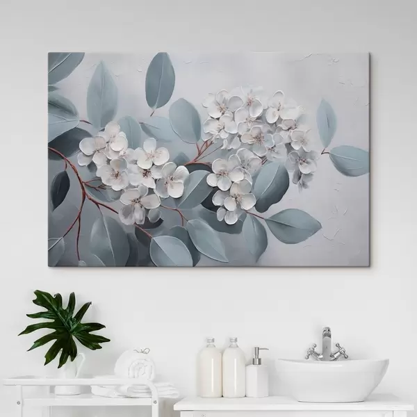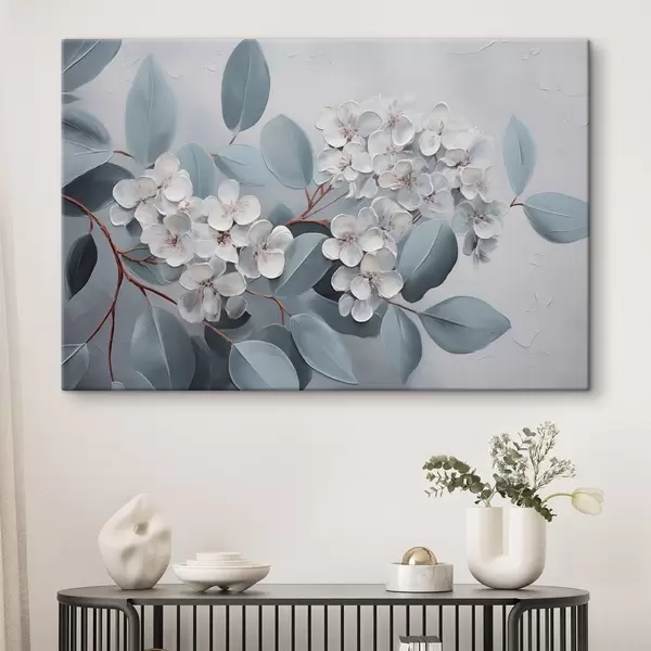 Schilderijen Een tak witte hortensia bloemen in volle bloei, met blauwe bladeren op een lichtgrijze achtergrond, olieverfschilderij stijl s43391