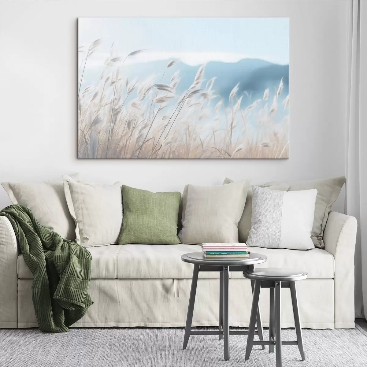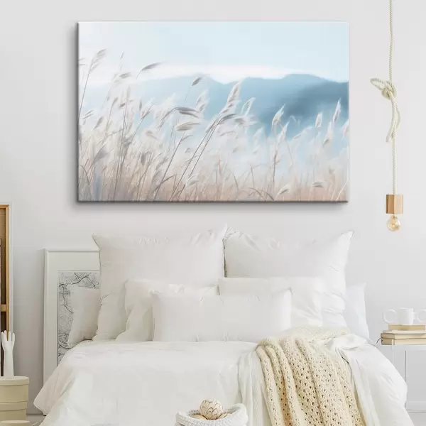Schilderij Gras, pampaveld met een blauwe berg op de achtergrond, lichtblauwe lucht, minimalistisch, pastelkleuren Art. s43404