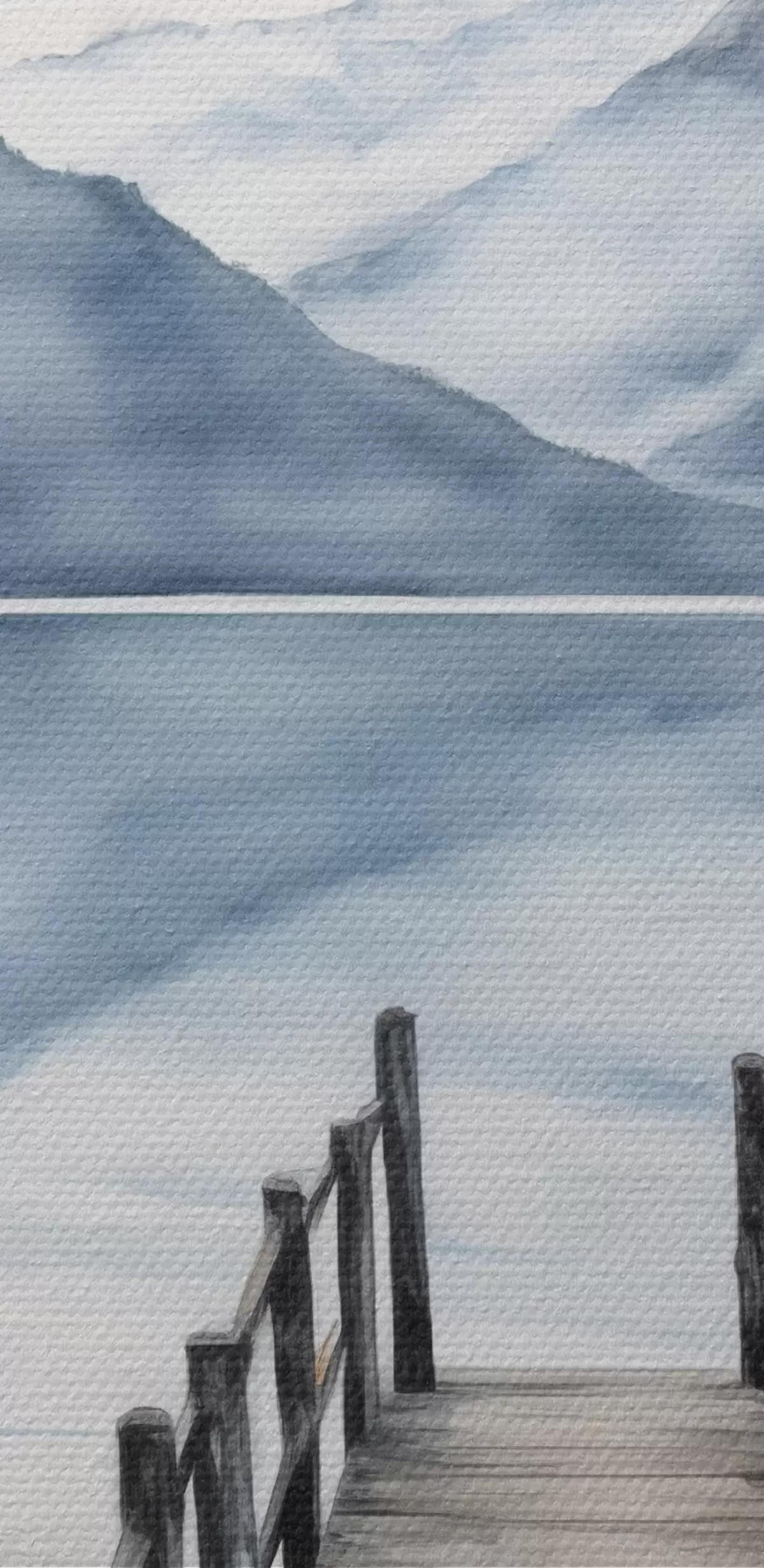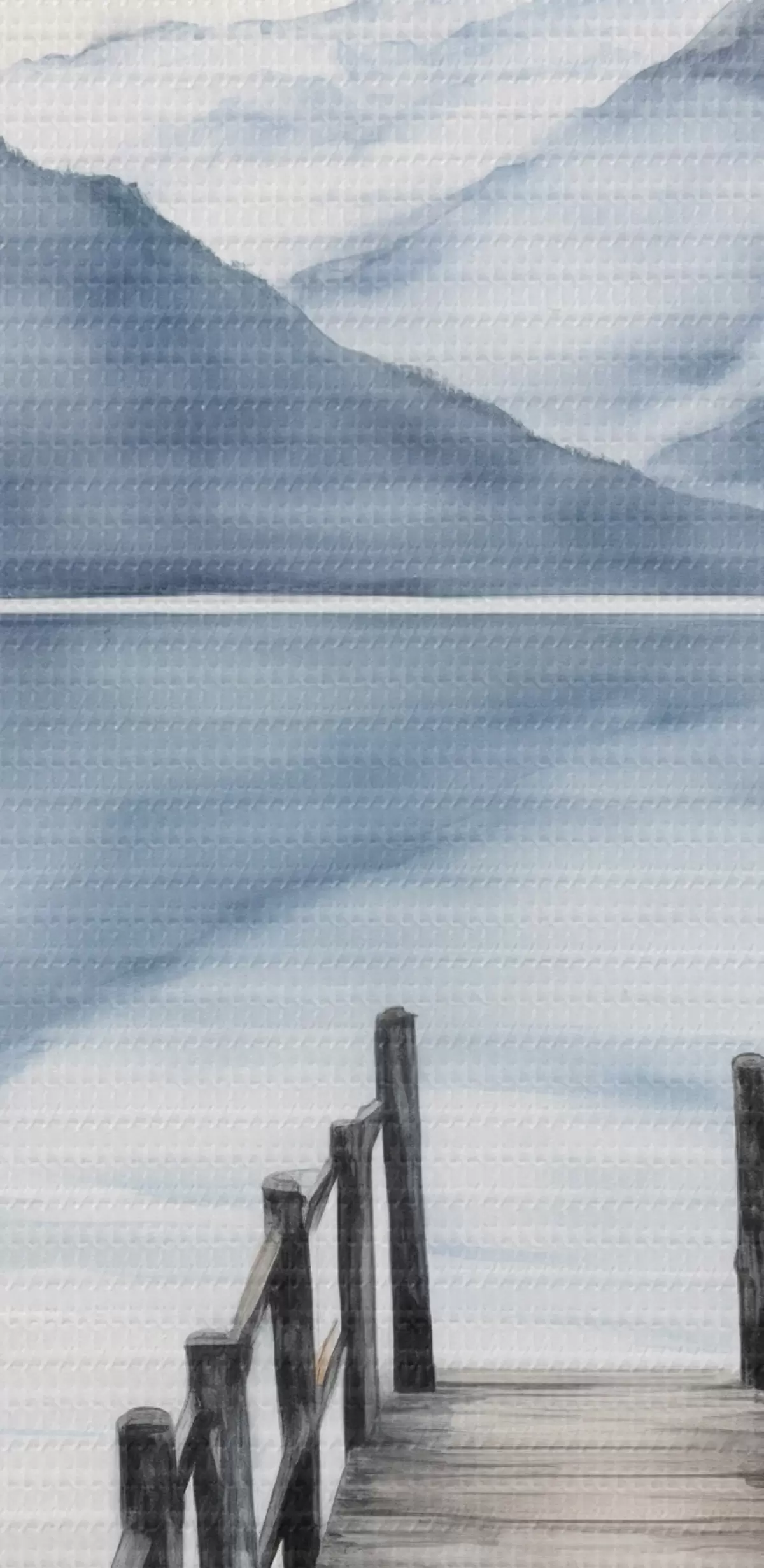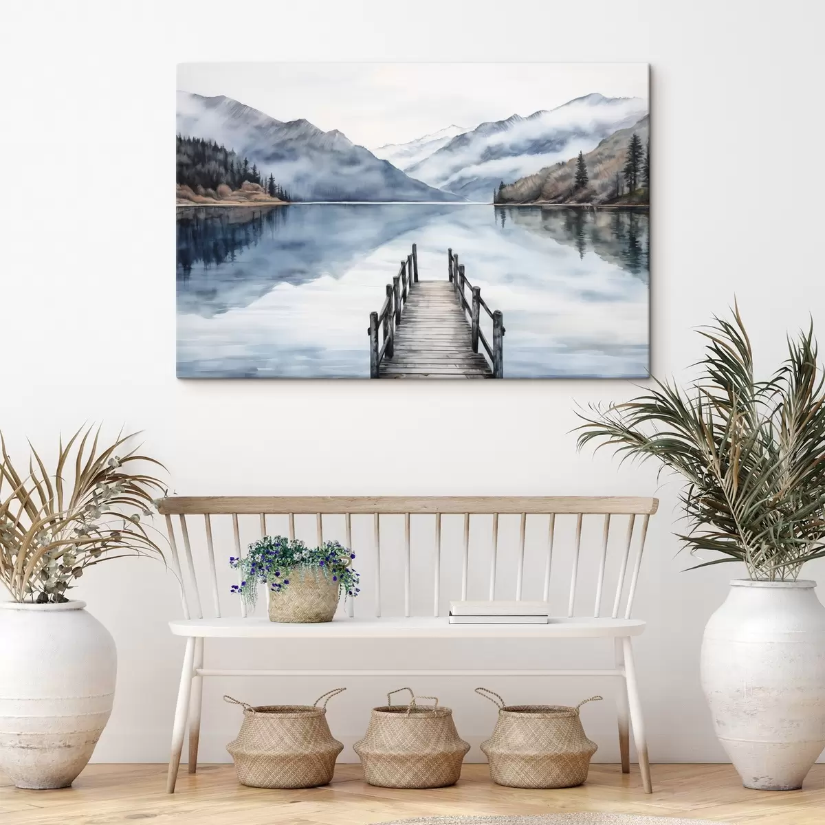 Schilderijen Een houten steiger strekt zich uit in een kalm meer, omringd door bergen en altijd groene bomen, aquarelstijl s43405