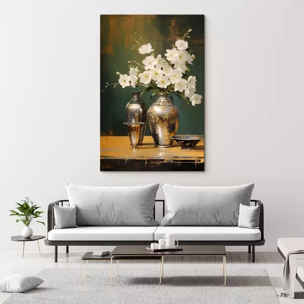 Schilderij Een stilleven van witte bloemen in een vaas, met decoratieve vazen en een schaal op een groene tafel, donkergroene achtergrond Art. s43408