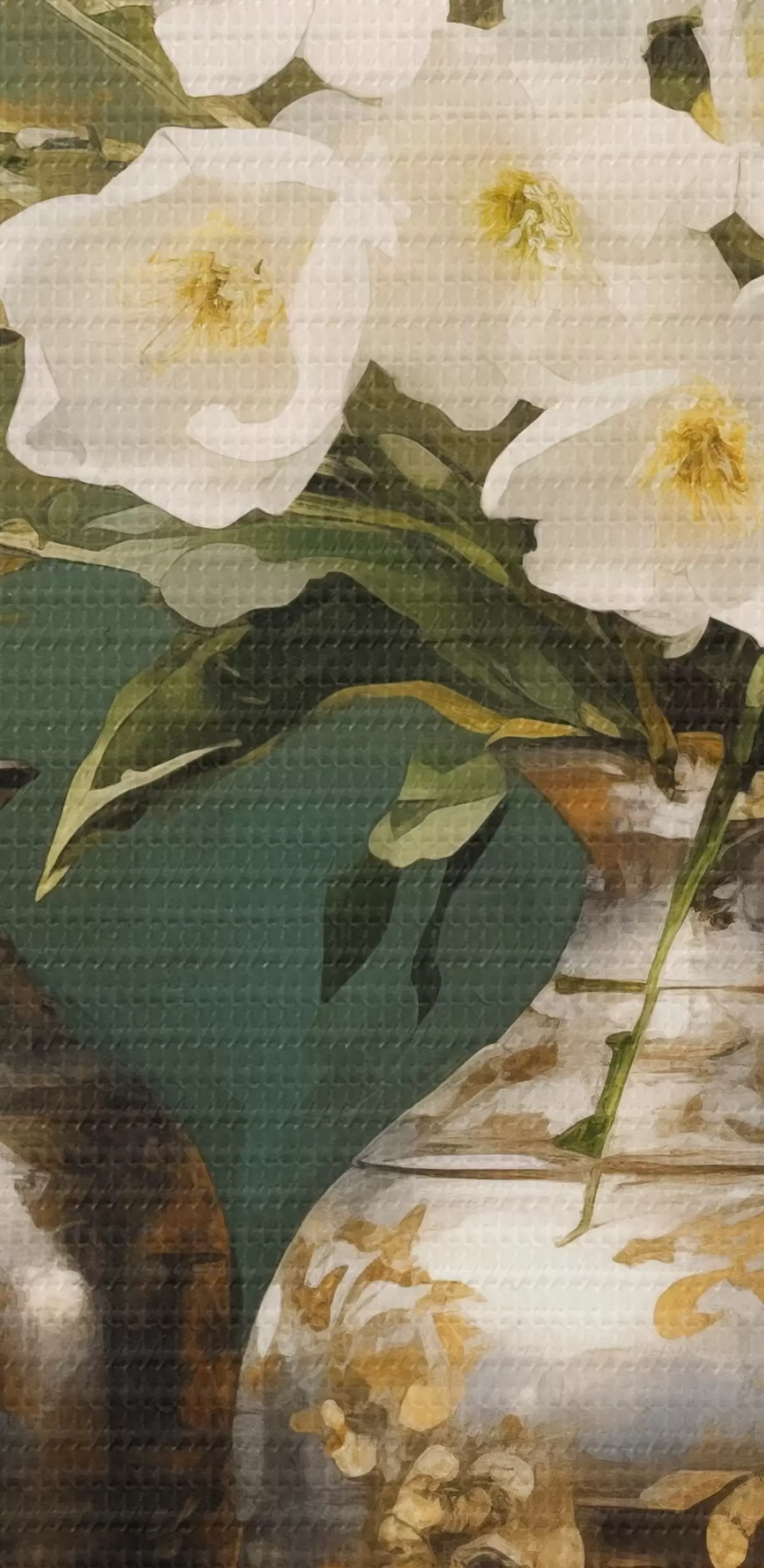 Schilderijen Een stilleven van witte bloemen in een vaas, met decoratieve vazen en een schaal op een groene tafel, donkergroene achtergrond s43408