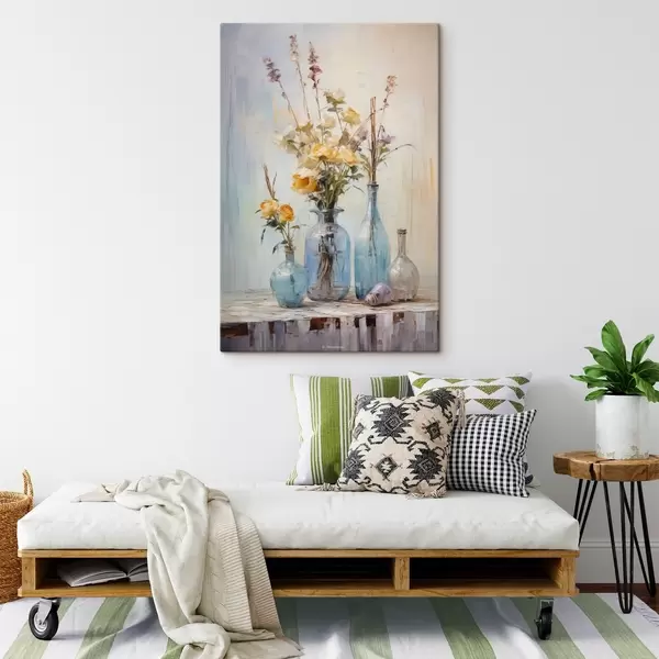 Schilderijen Een stilleven van gele rozen in blauwe glazen vazen, licht gestructureerde achtergrond, zachte penseelstreken, stijl olieverfschilderij s43409
