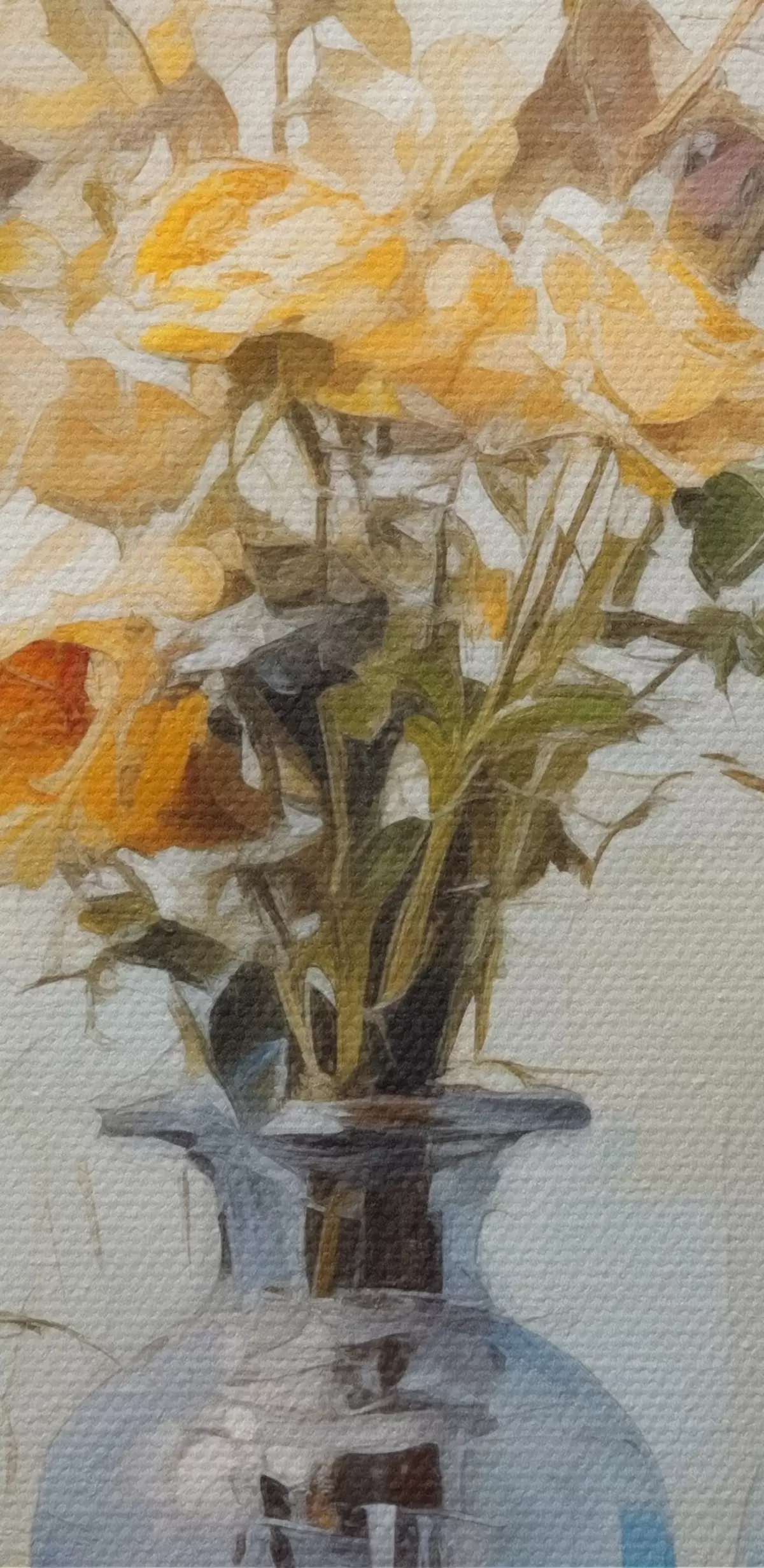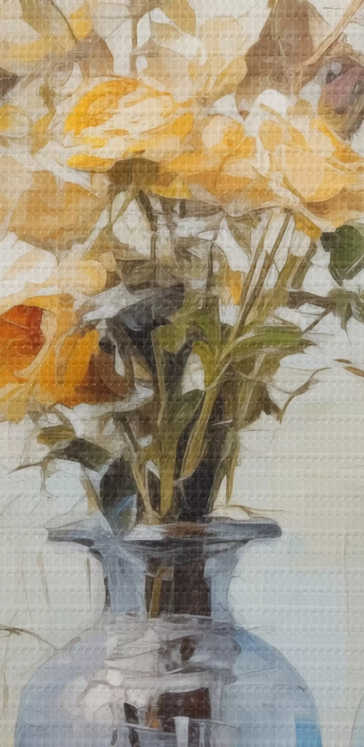Schilderij Een stilleven van gele rozen in blauwe glazen vazen, licht gestructureerde achtergrond, zachte penseelstreken, stijl olieverfschilderij Art. s43409