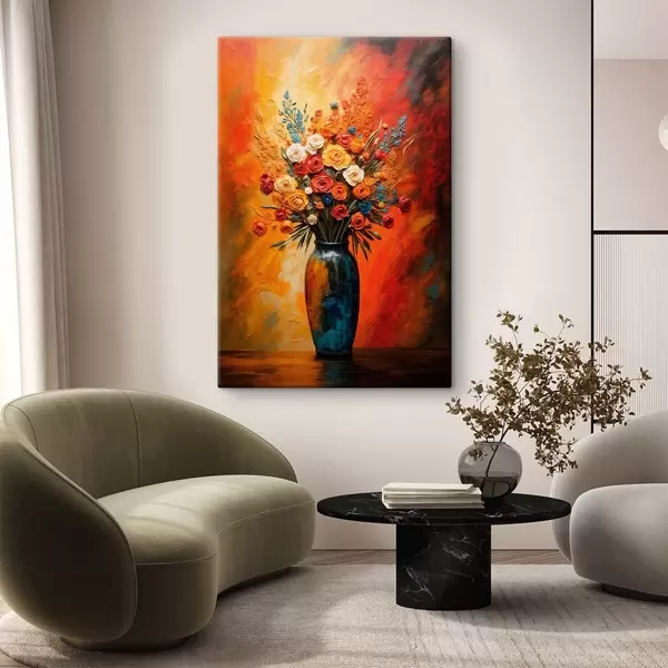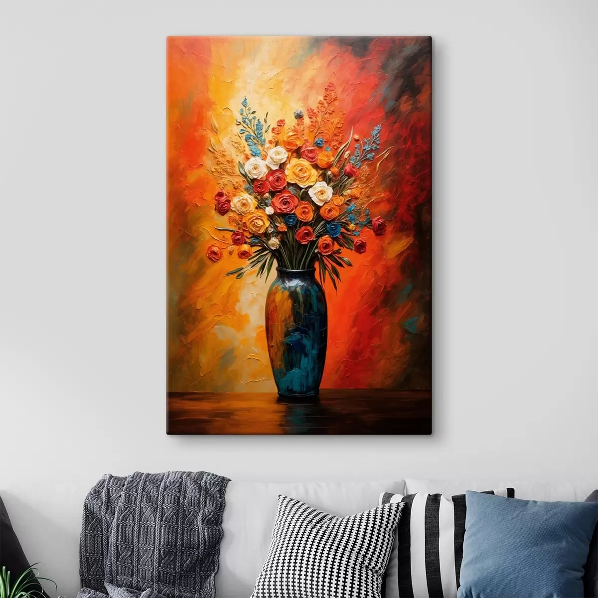 Schilderij Verschillende bloemen in vaas op rood-gele achtergrond Art. s43867