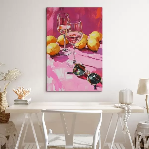Schilderijen Abstractie in olieverfstijl met glazen drank, citroenen en zonnebrillen s43884