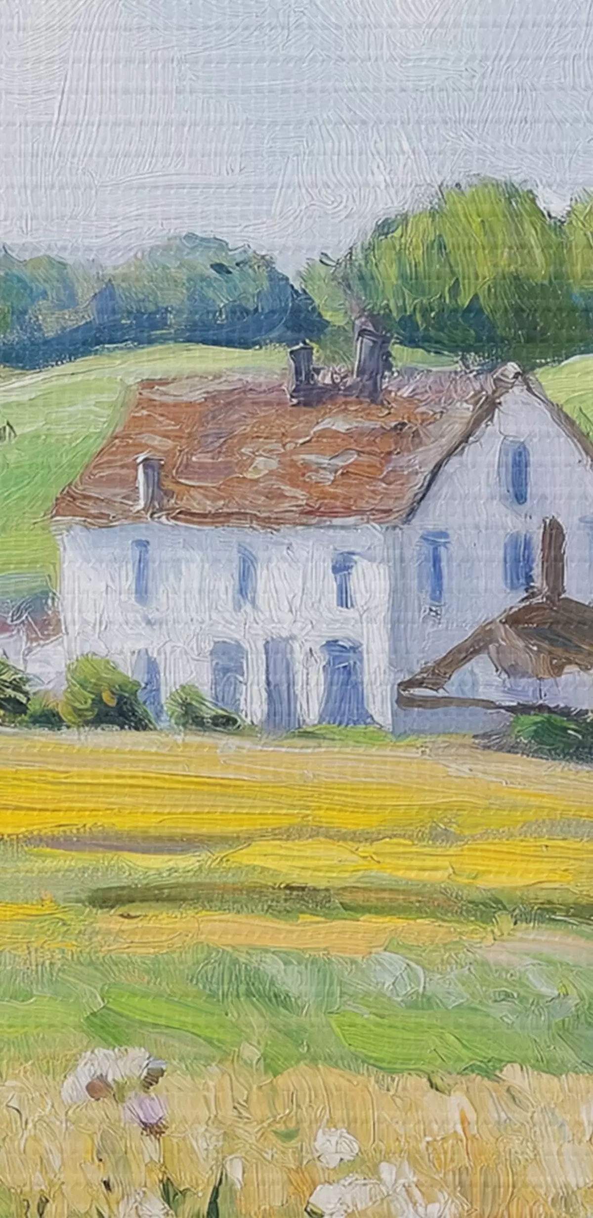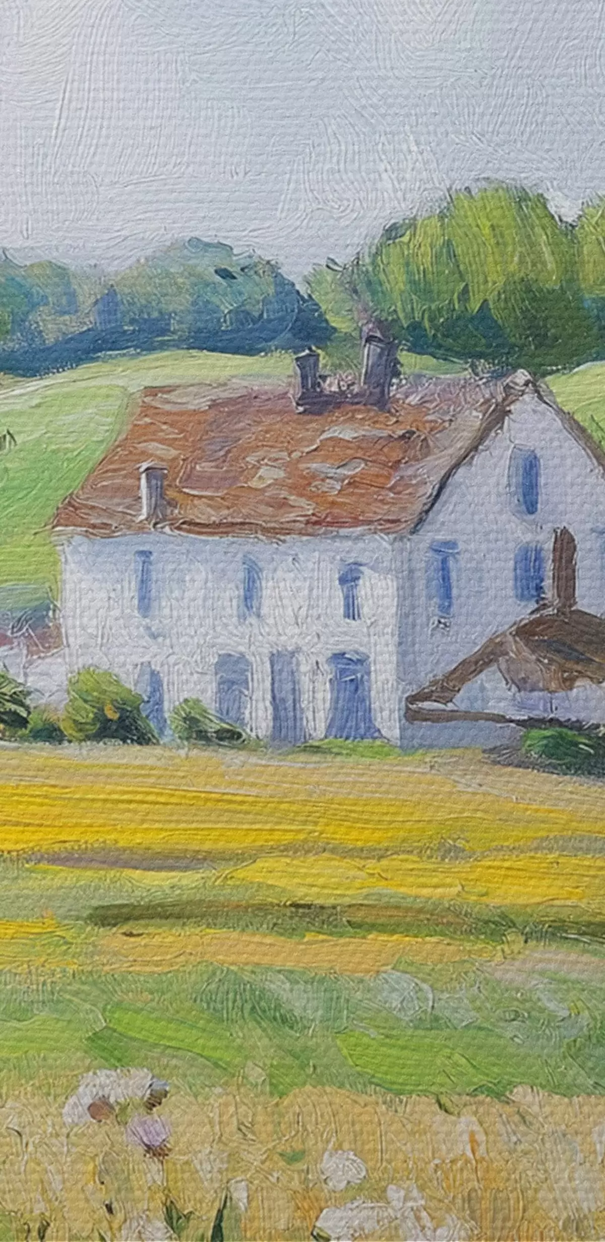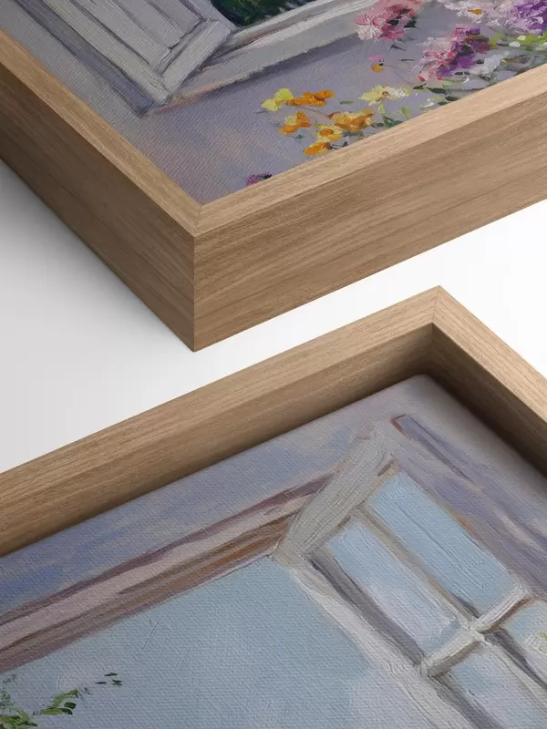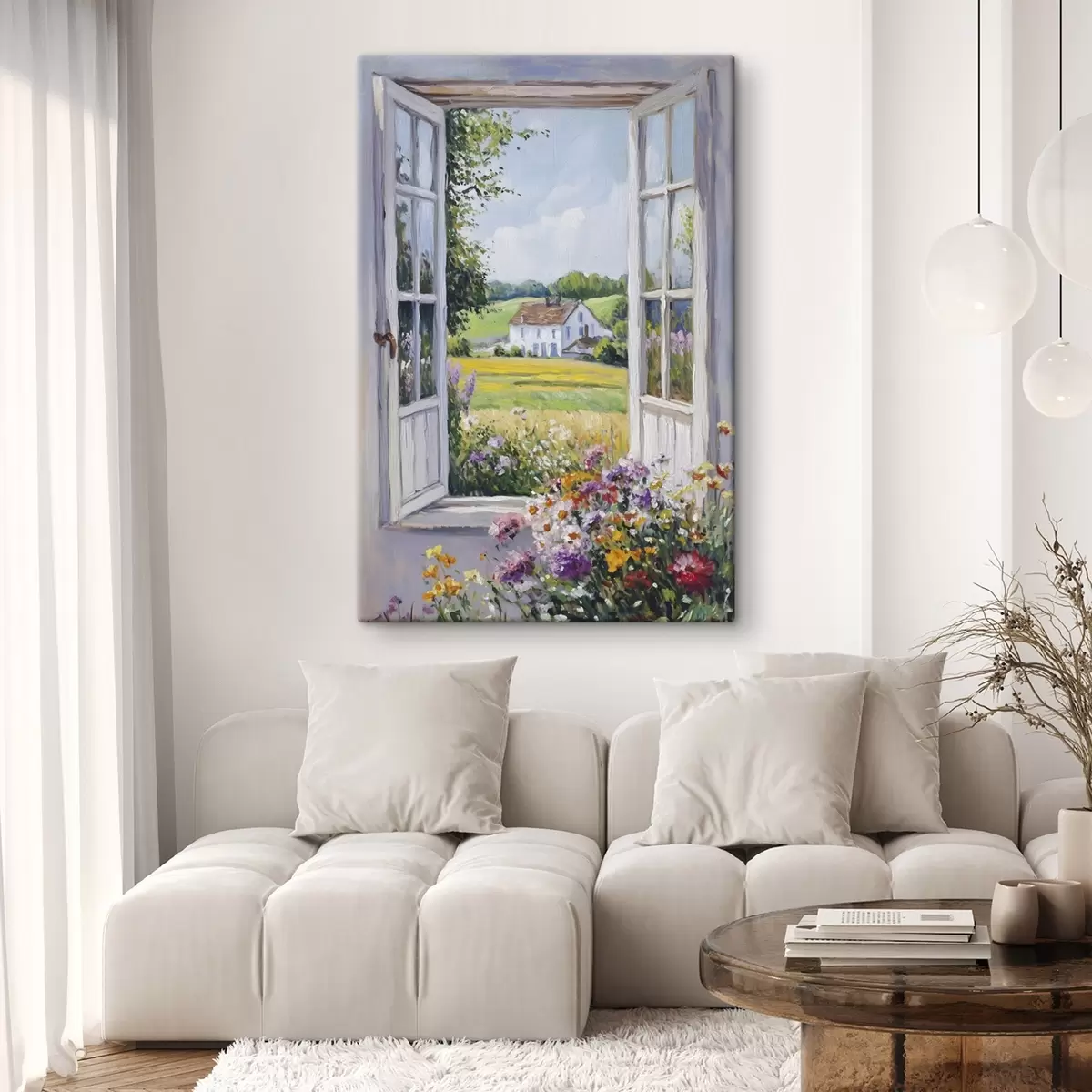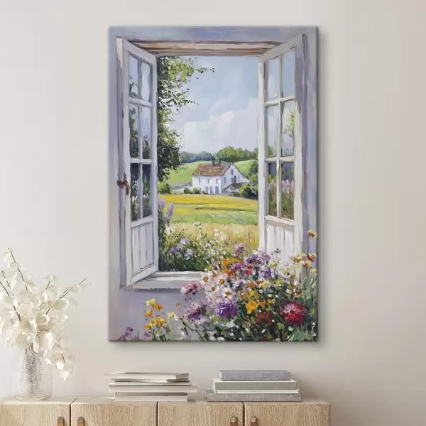 Schilderijen Dorpslandschappen in het houten venster, bloemen, velden, olieverfstijl, boerderij s43888