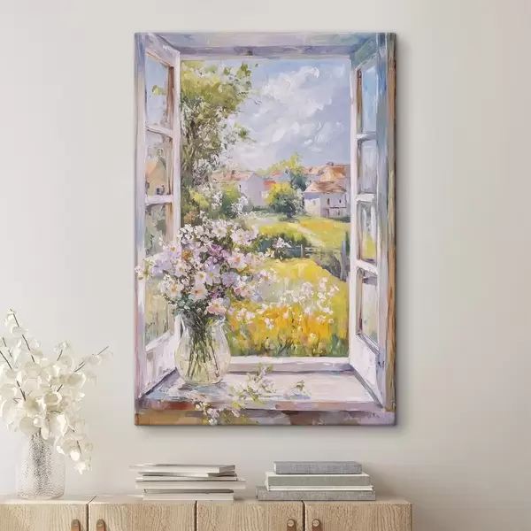 Schilderijen Zomer in het dorp, rustiek, tekening in olieverfstijl, bloemen in vaas s43889