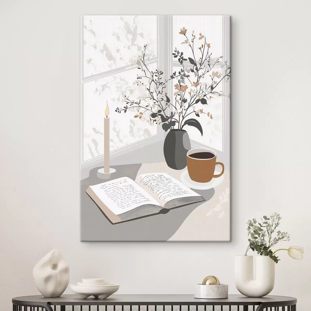 Schilderijen Abstractie, open boek, vaas met bloemen, kaars, beige kleuren s44011