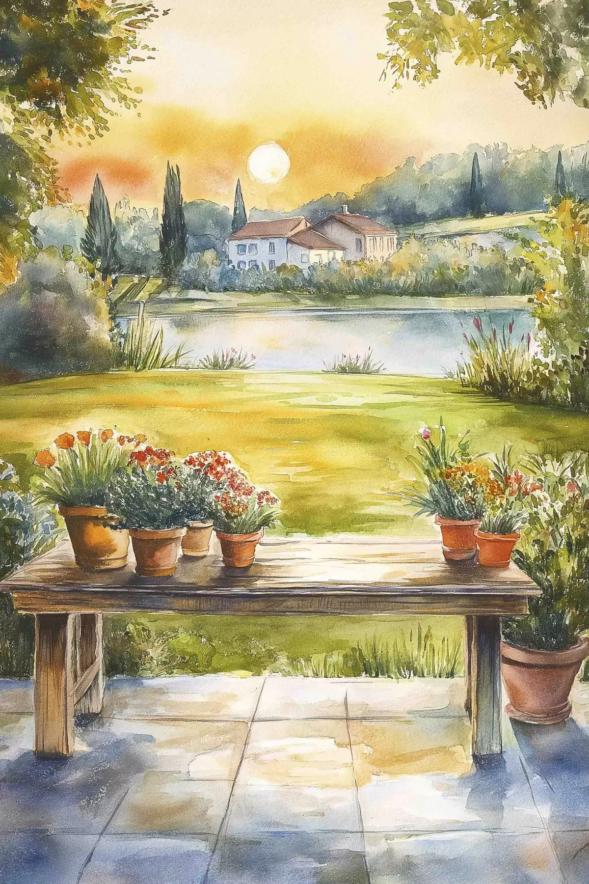 Schilderijen Dorp op de zonsondergang, rustiek, zomer bloemen, meer, aquarel stijl s44016