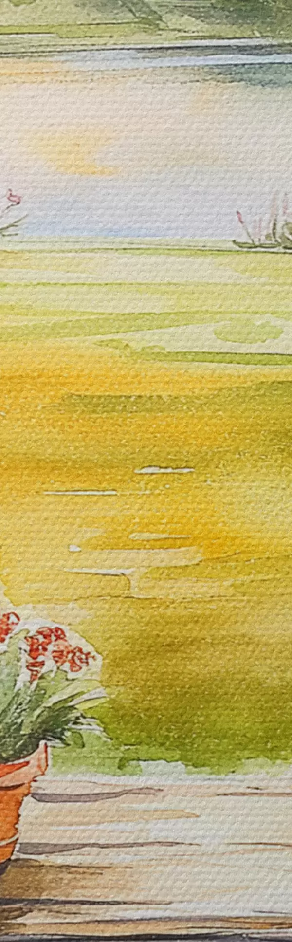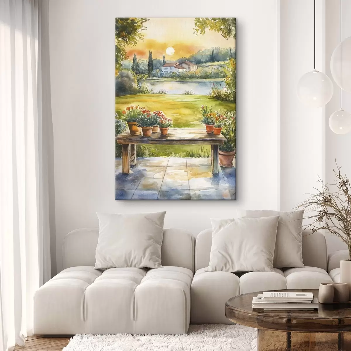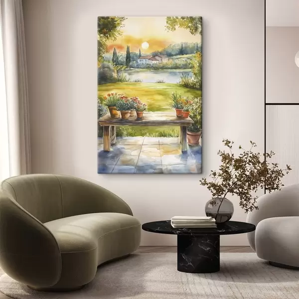 Schilderij Dorp op de zonsondergang, rustiek, zomer bloemen, meer, aquarel stijl Art. s44016