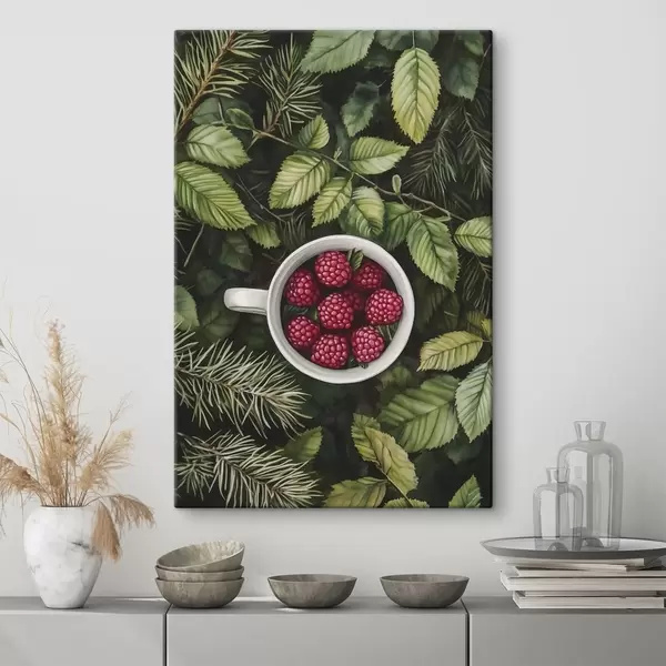 Schilderij Kopje frambozen in het groene bos, natuur, aquarel stijl Art. s44021