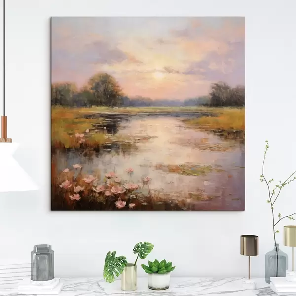 Schilderij Waterlichaam met bloemen bij zonsondergang Art. s44044