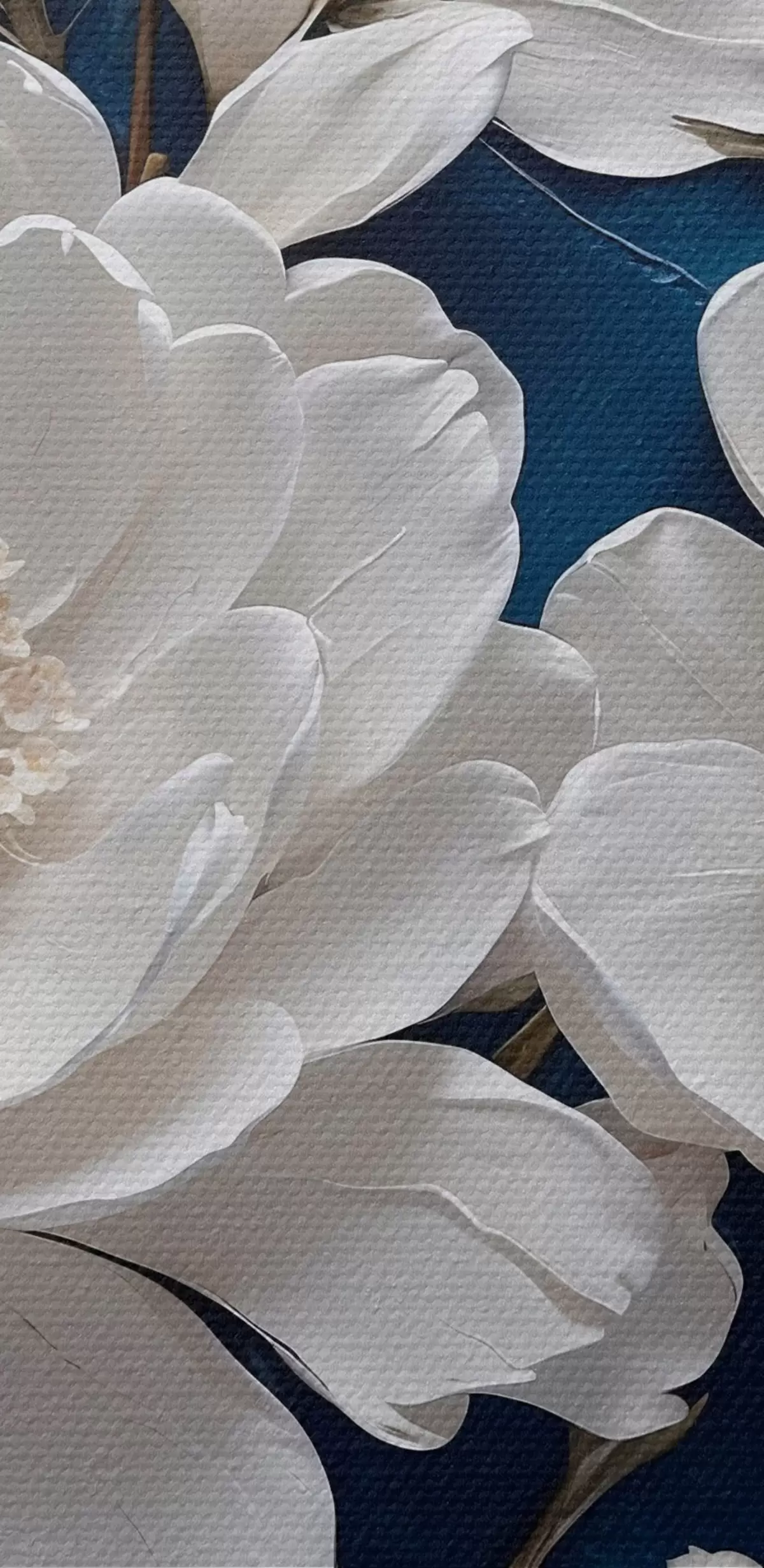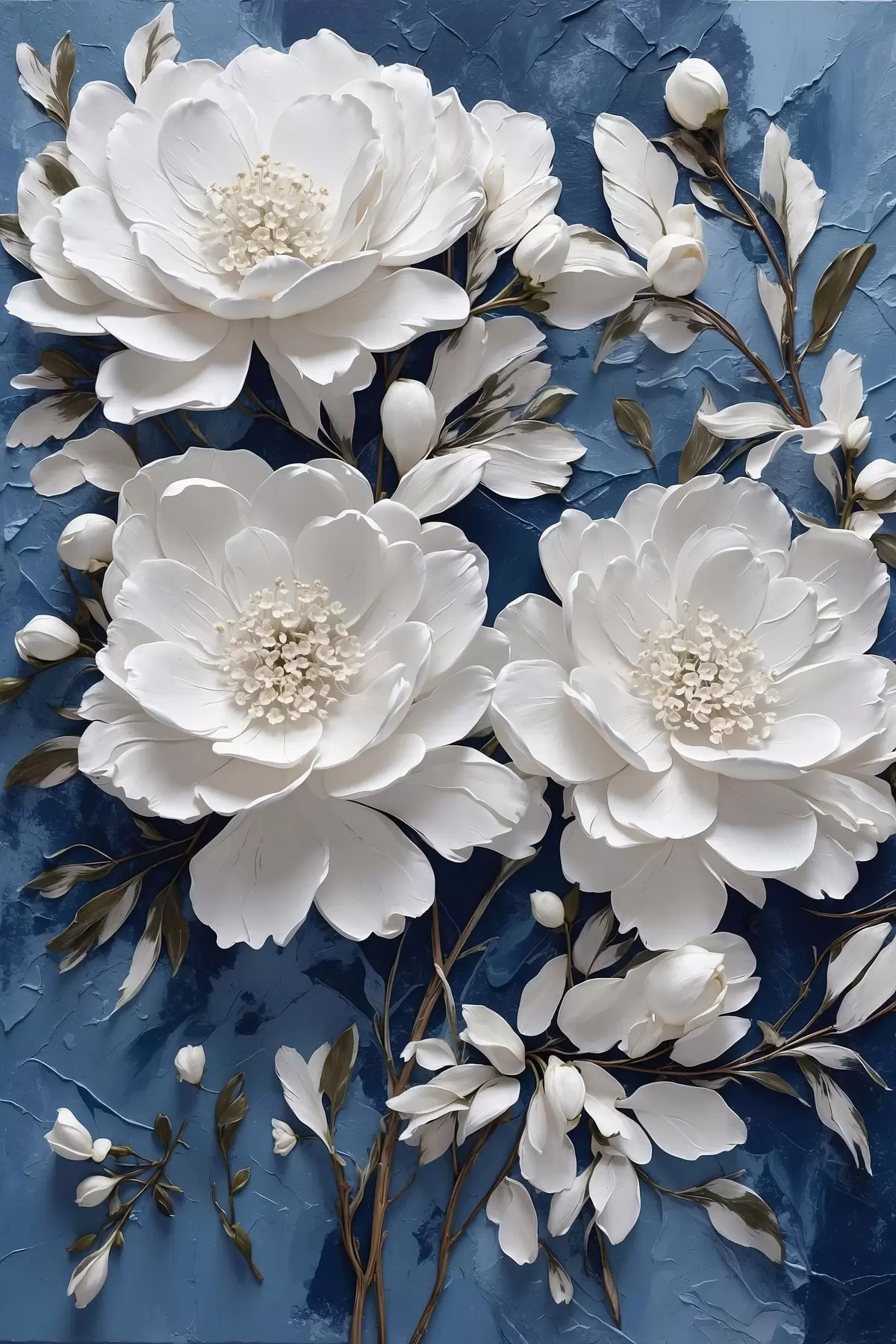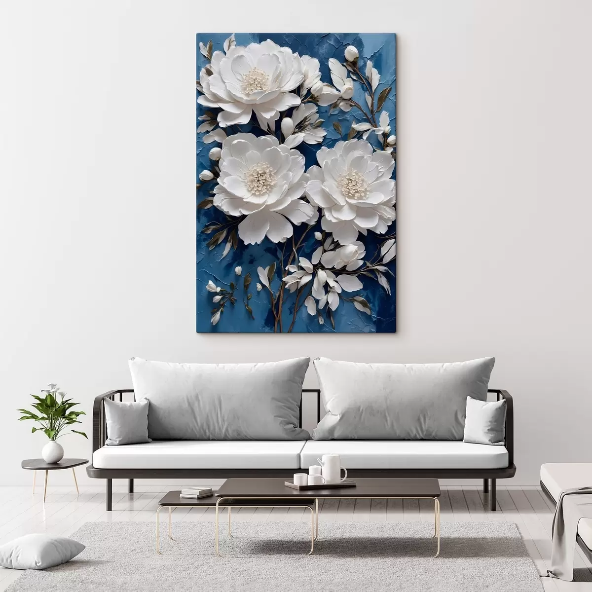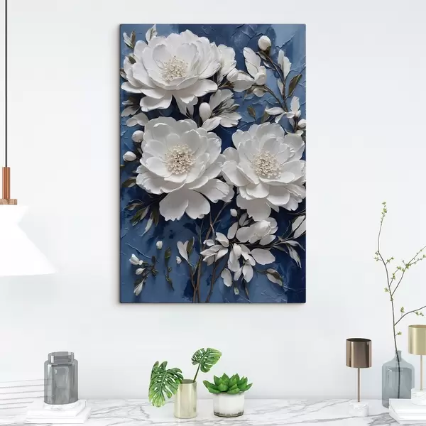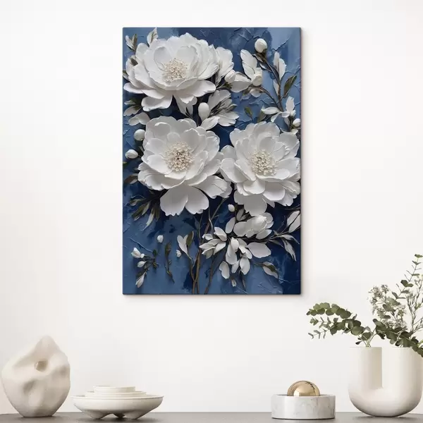 Schilderij Witte bloemen op blauwe olieverf achtergrond Art. s44091