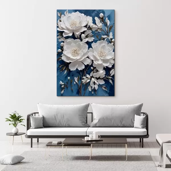 Schilderijen Witte bloemen op blauwe olieverf achtergrond s44091