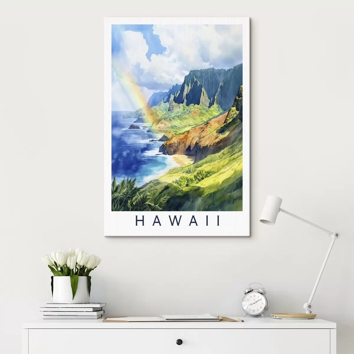 Schilderijen Hawaii eiland, aquarel stijl, regenboog, groene bergen, oceaan s44141
