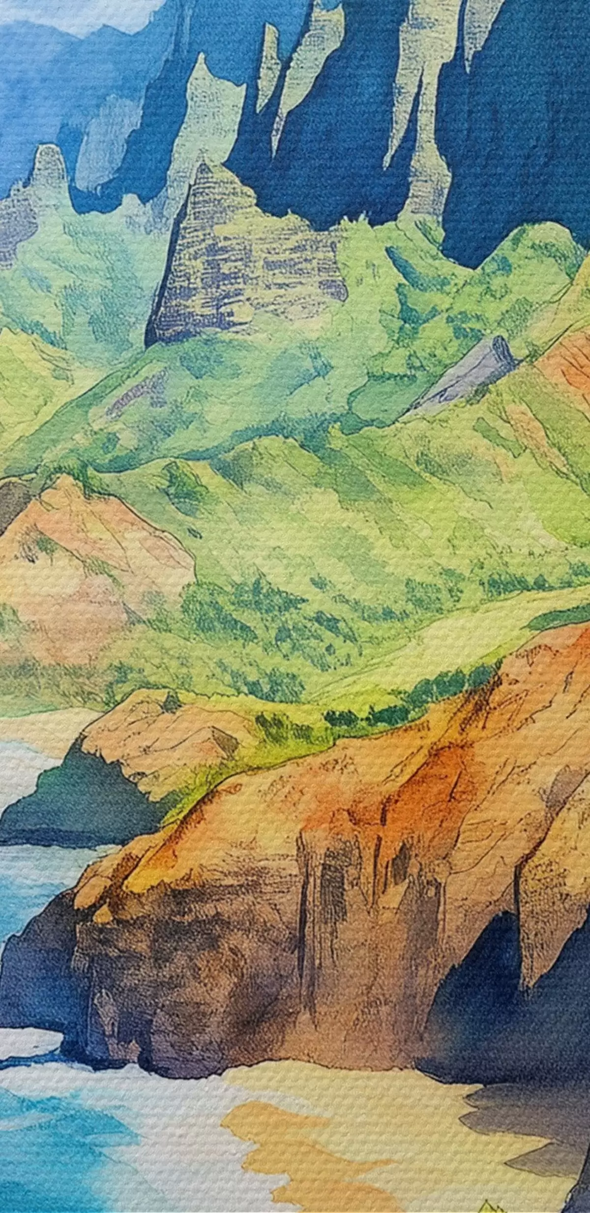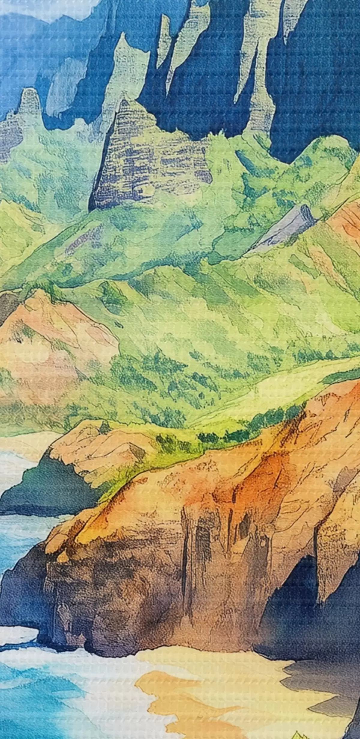 Schilderij Hawaii eiland, aquarel stijl, regenboog, groene bergen, oceaan Art. s44141