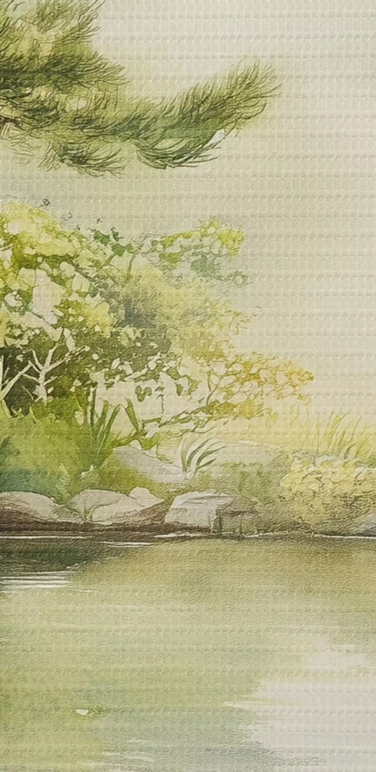 Schilderijen Oosterse tuin met meer en bomen, natuur, aquarelstijl s44313