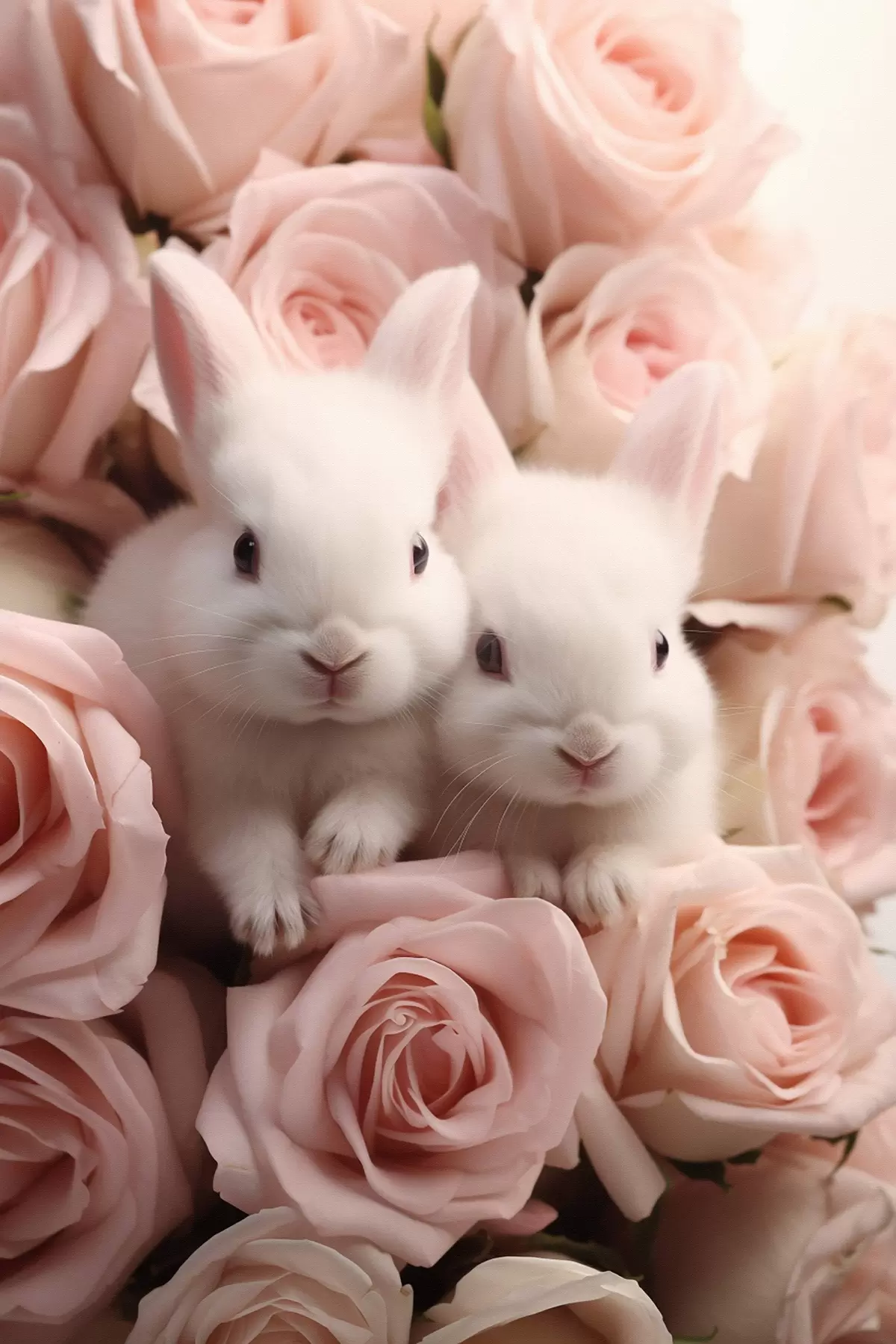 Schilderijen Twee witte konijnen in tere rozenbloemen s44380