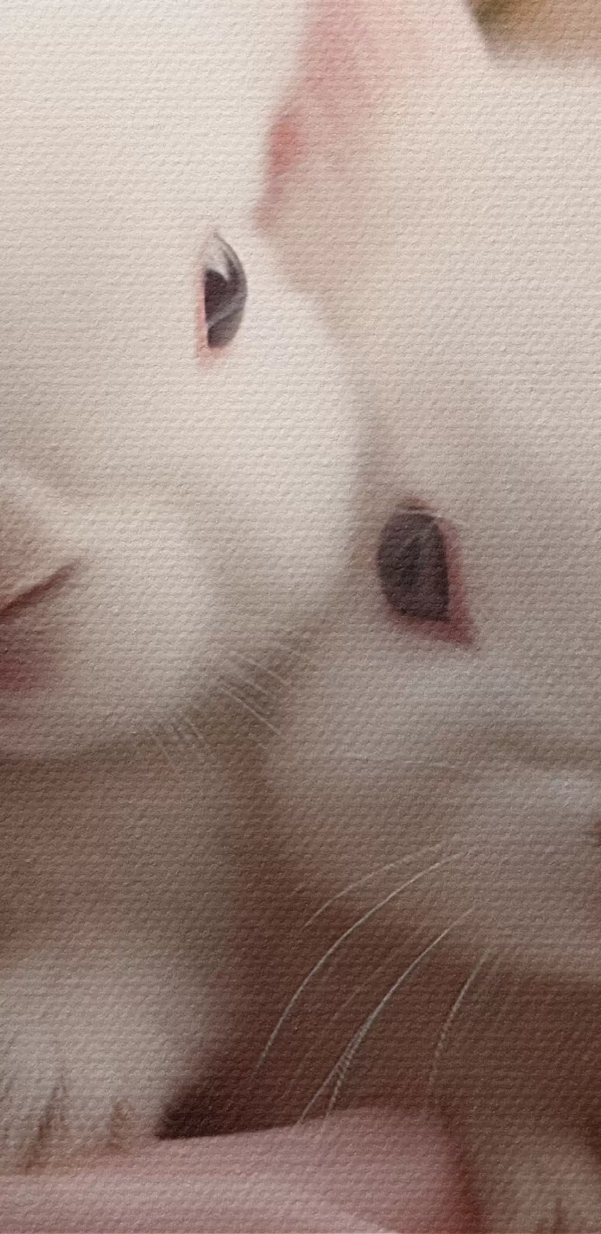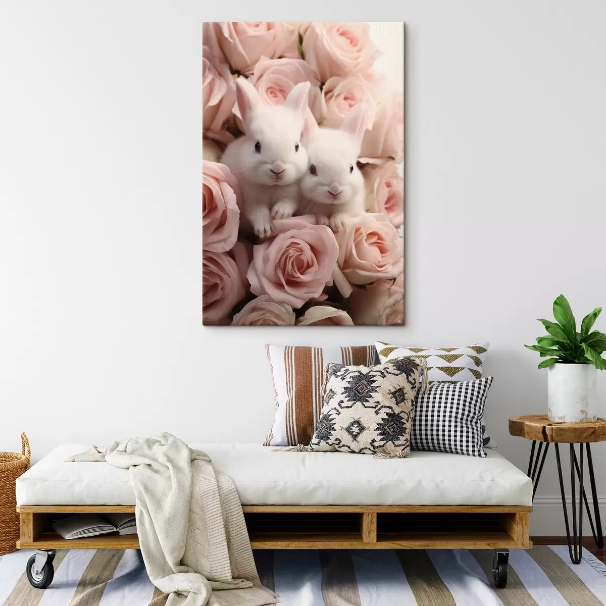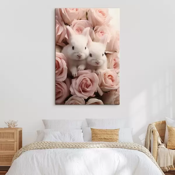 Schilderij Twee witte konijnen in tere rozenbloemen Art. s44380