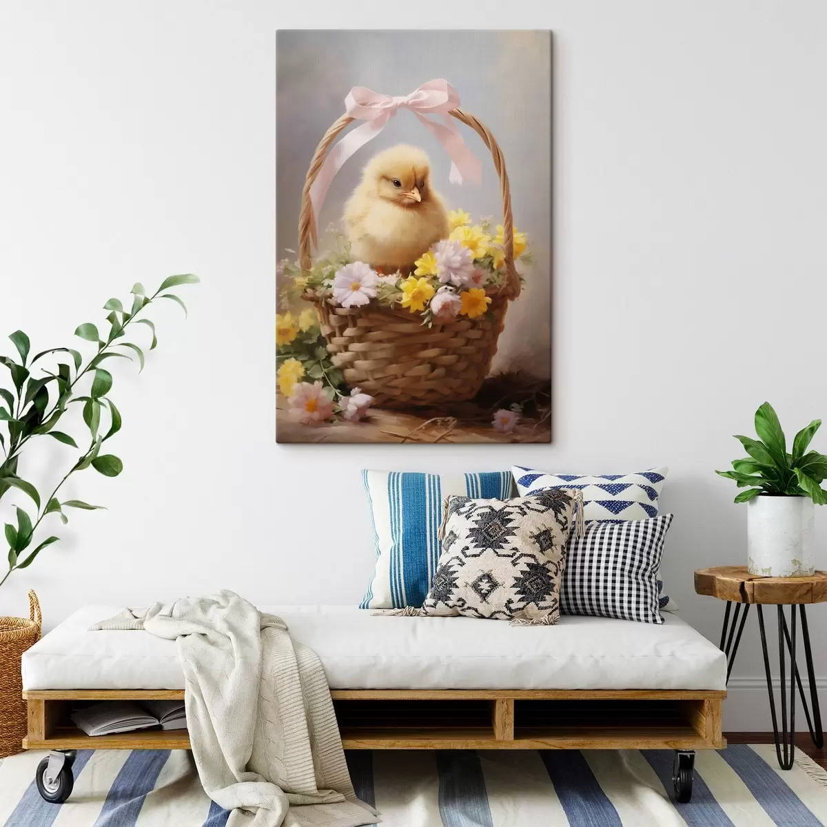 Schilderijen Geel kuiken in een mand met wilde bloemen s44384