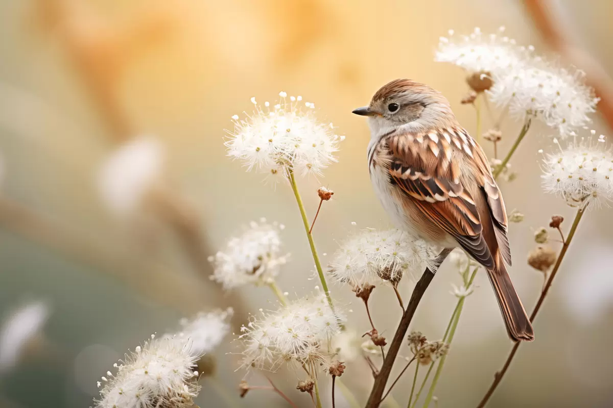 Schilderijen Een vogel neergestreken op een tak met witte bloemen, zachte focus, natuur achtergrond s44393