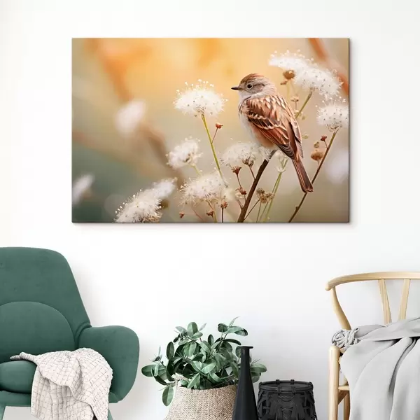 Schilderij Een vogel neergestreken op een tak met witte bloemen, zachte focus, natuur achtergrond Art. s44393
