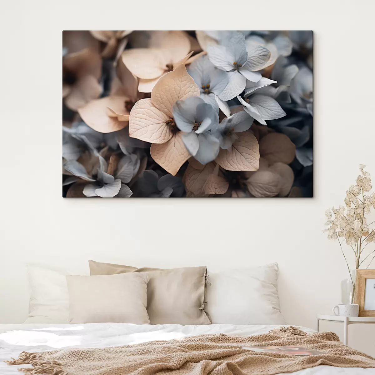 Schilderij Hortensiabloemen, lichtblauwe en beige bloemblaadjes, met gedetailleerde texturen, elegant bloemstuk Art. s44394