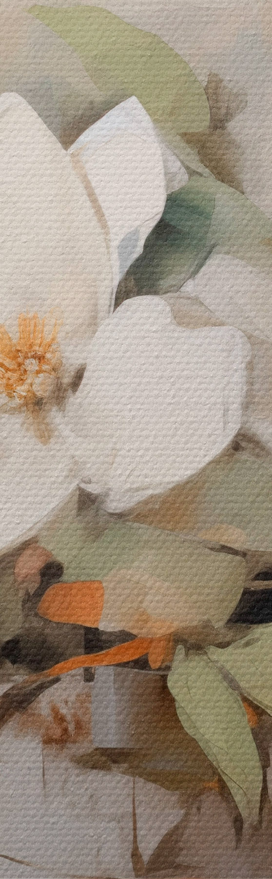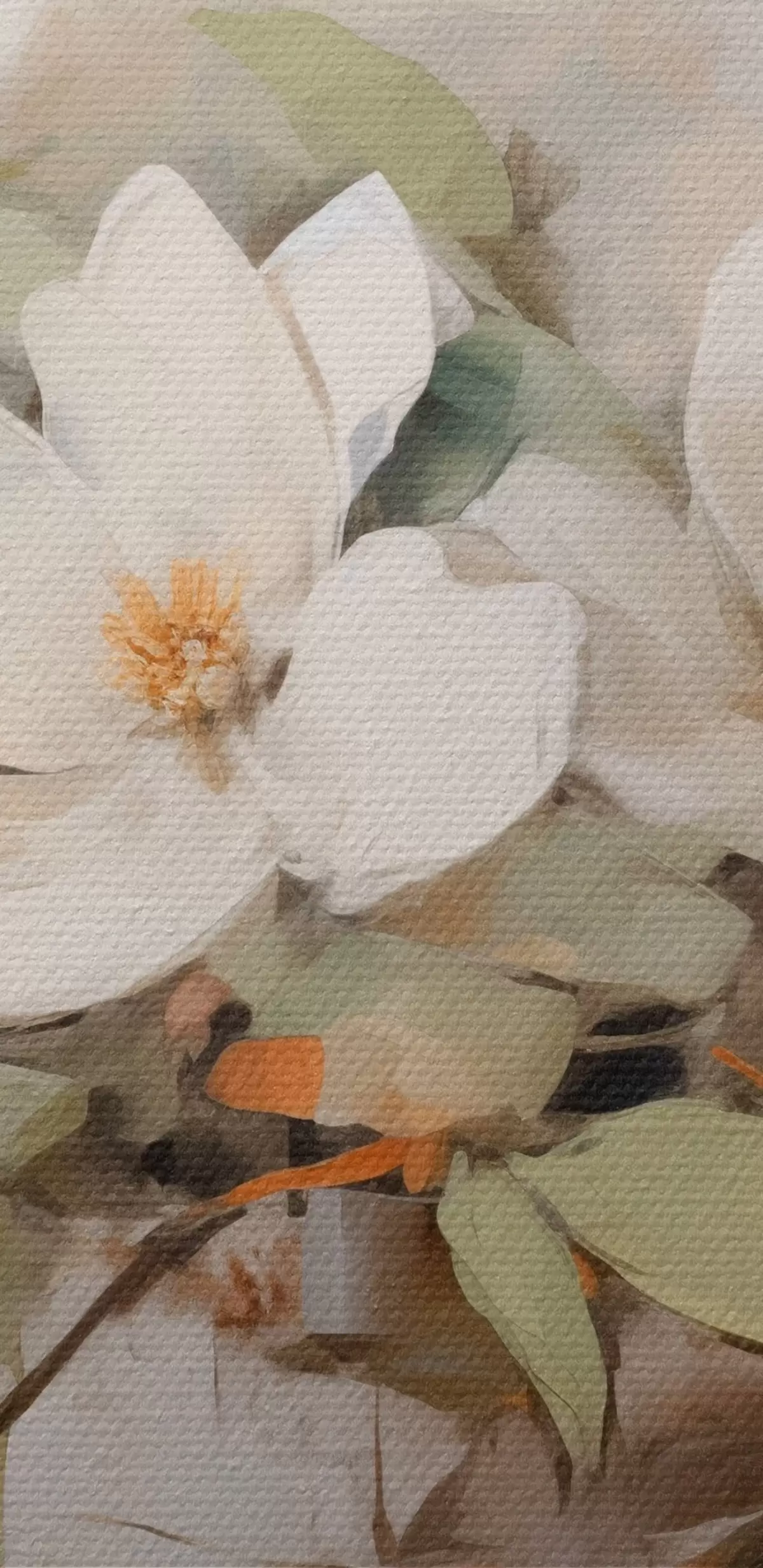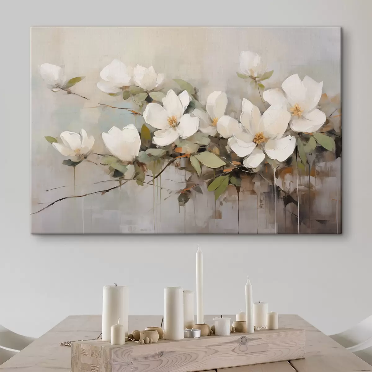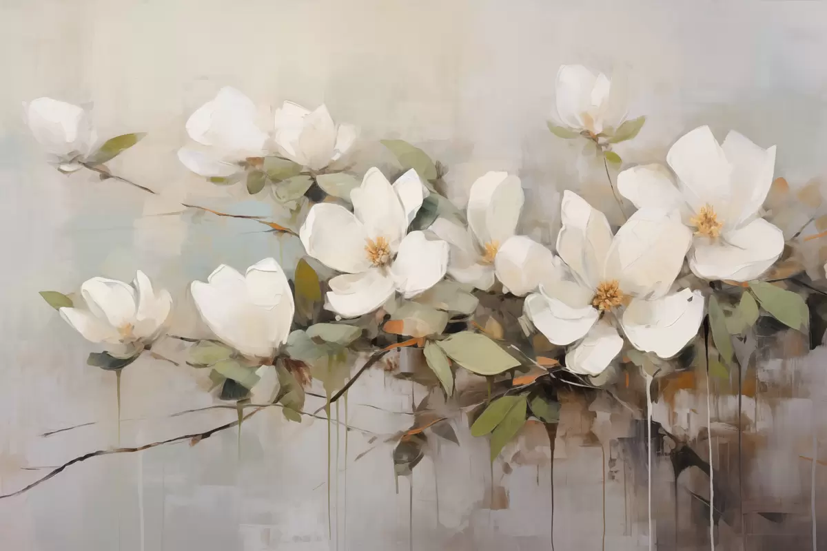 Schilderij Witte magnolia bloemen met groene bladeren op een tak, zachte penseelstreken, gedempte kleuren Art. s44404
