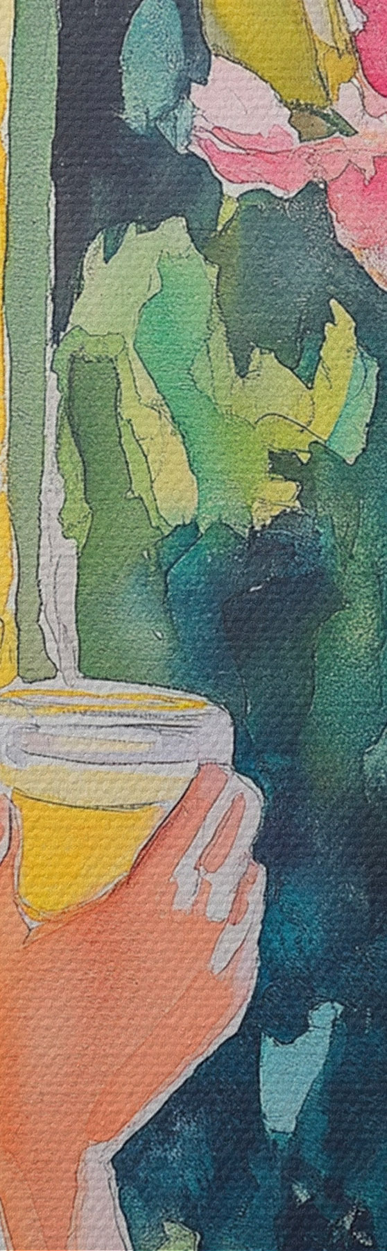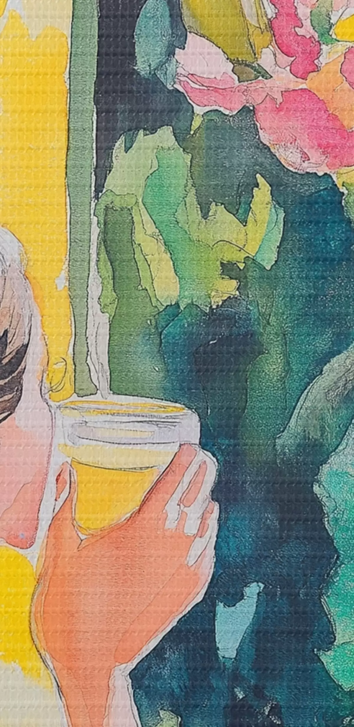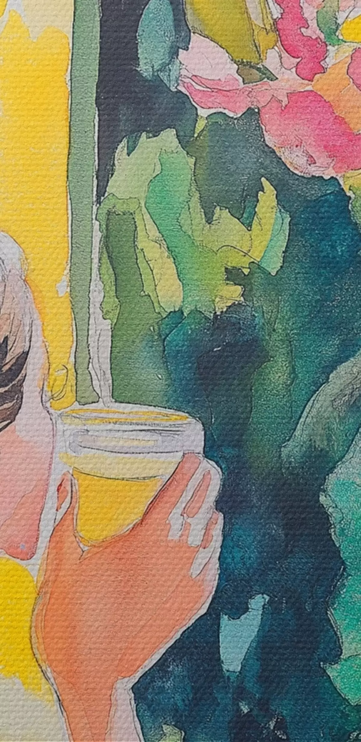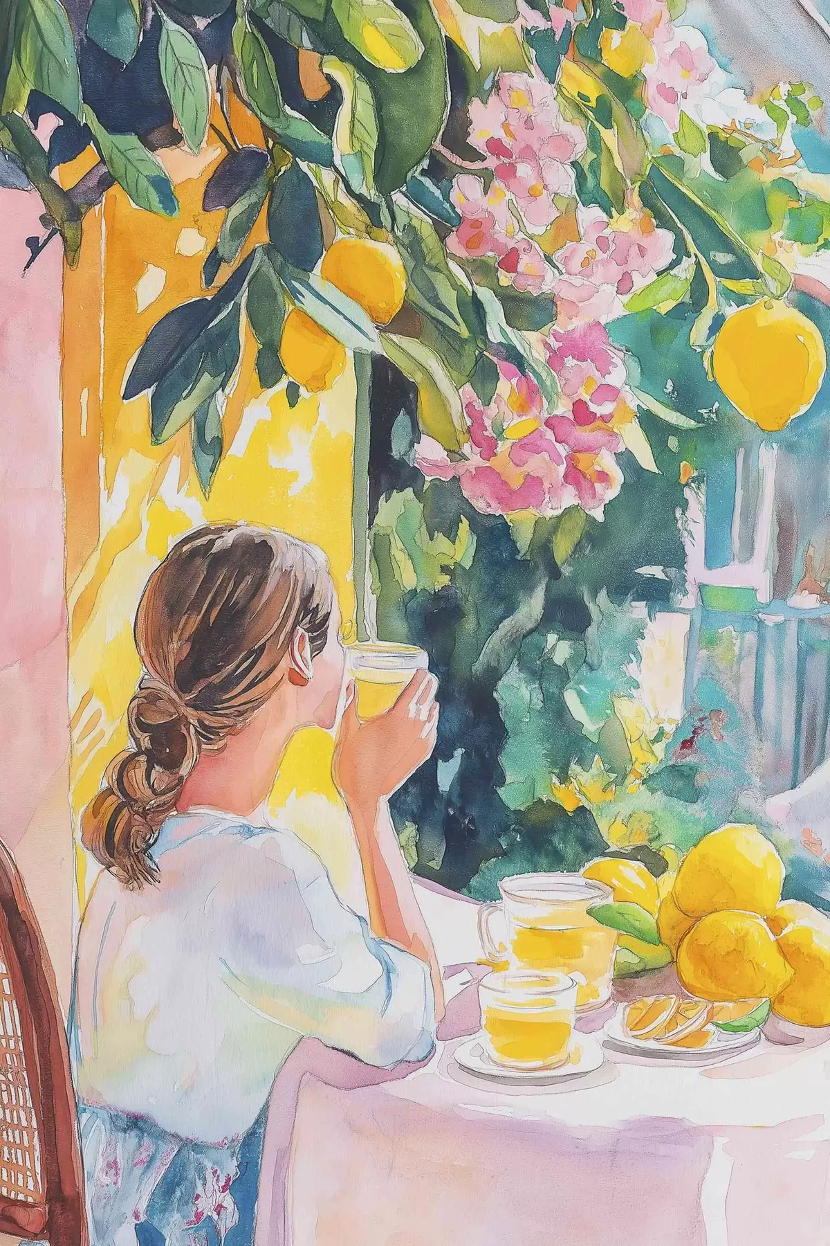 Schilderij Zomervibes, meisje in het café, limoncello, Italië, aquarelstijl Art. s44505