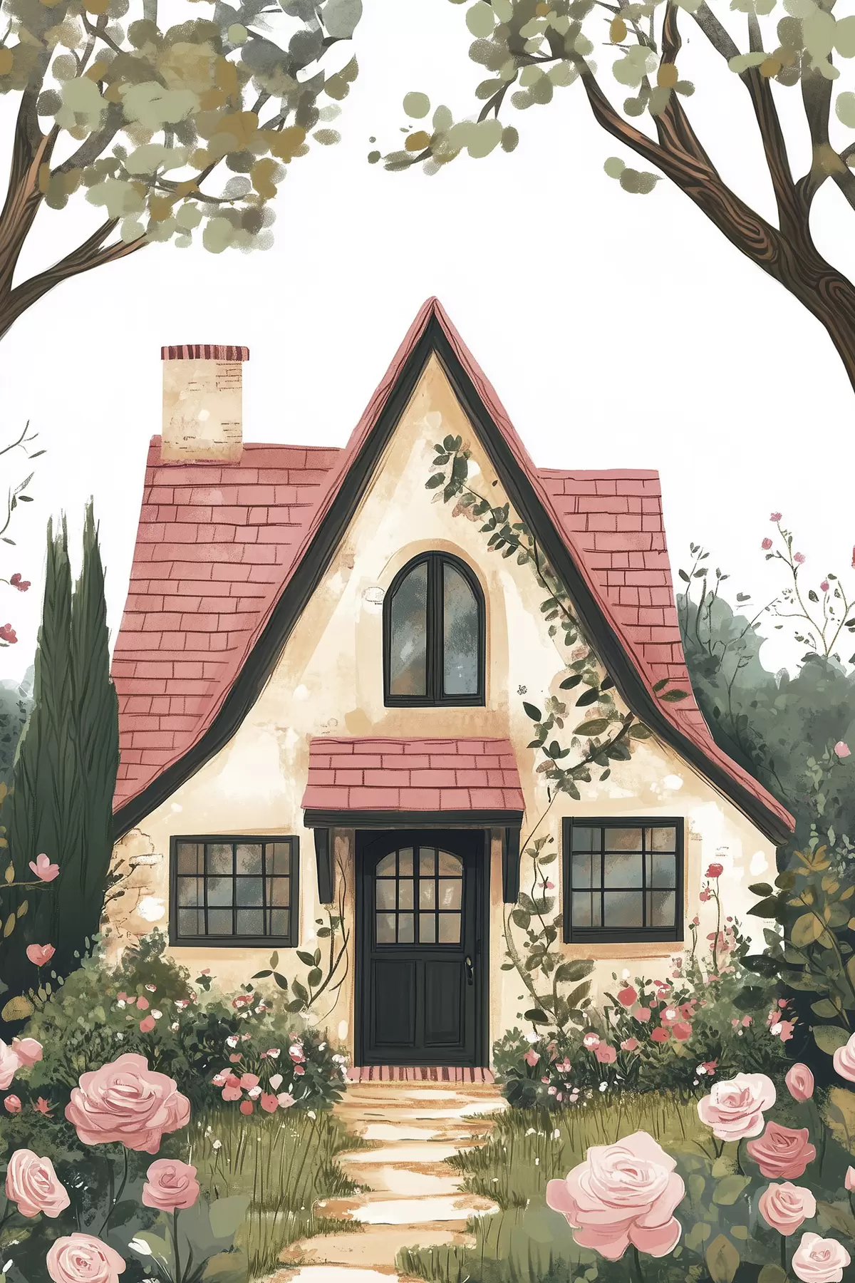 Schilderijen Een sprookjeshuis in het bos, rozen, pastelstijl s44718