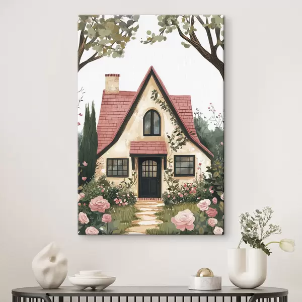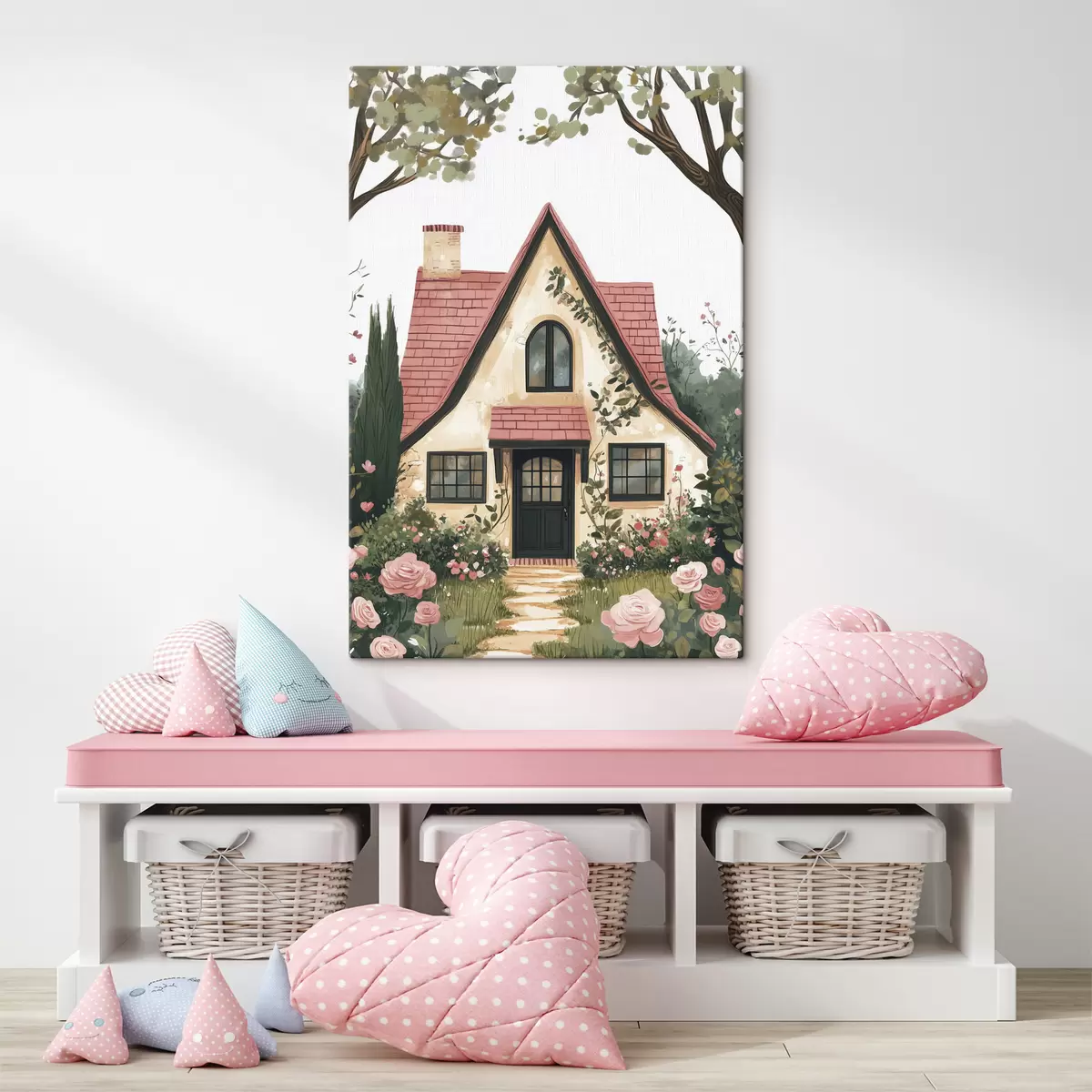 Schilderij Een sprookjeshuis in het bos, rozen, pastelstijl Art. s44718