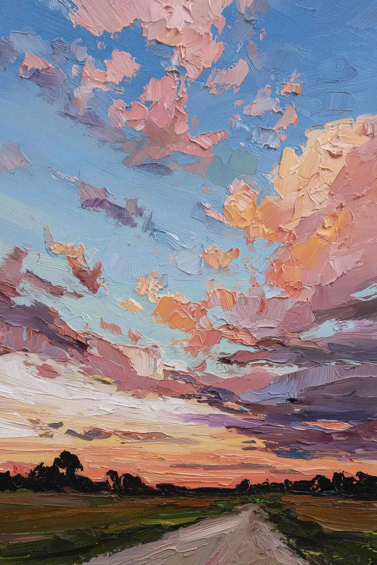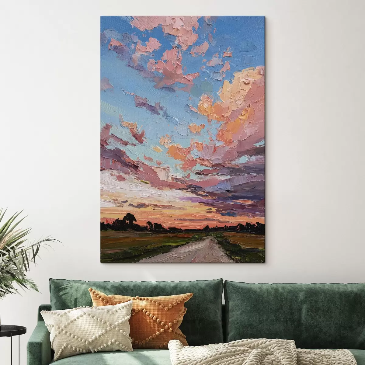 Schilderij Zonsondergang hemel, weg in het veld, levendige penseelstreken, olieverf stijl imitatie Art. s44795