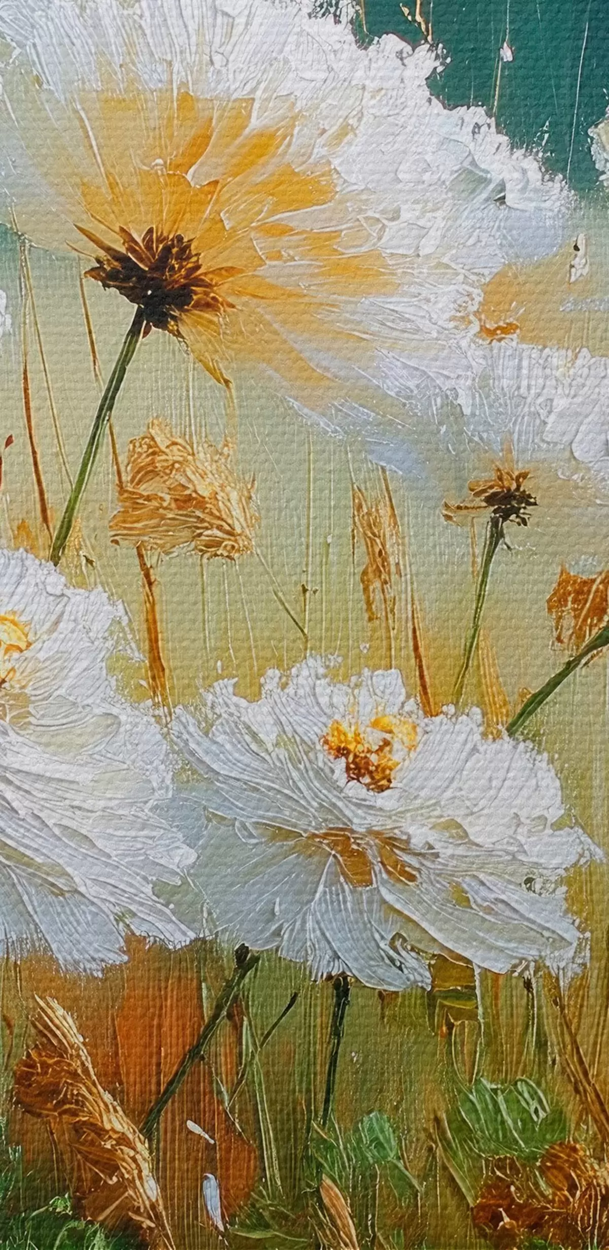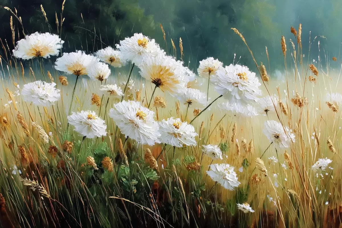 Schilderij Witte bloemen in een weide in olieverfstijl Art. s44842