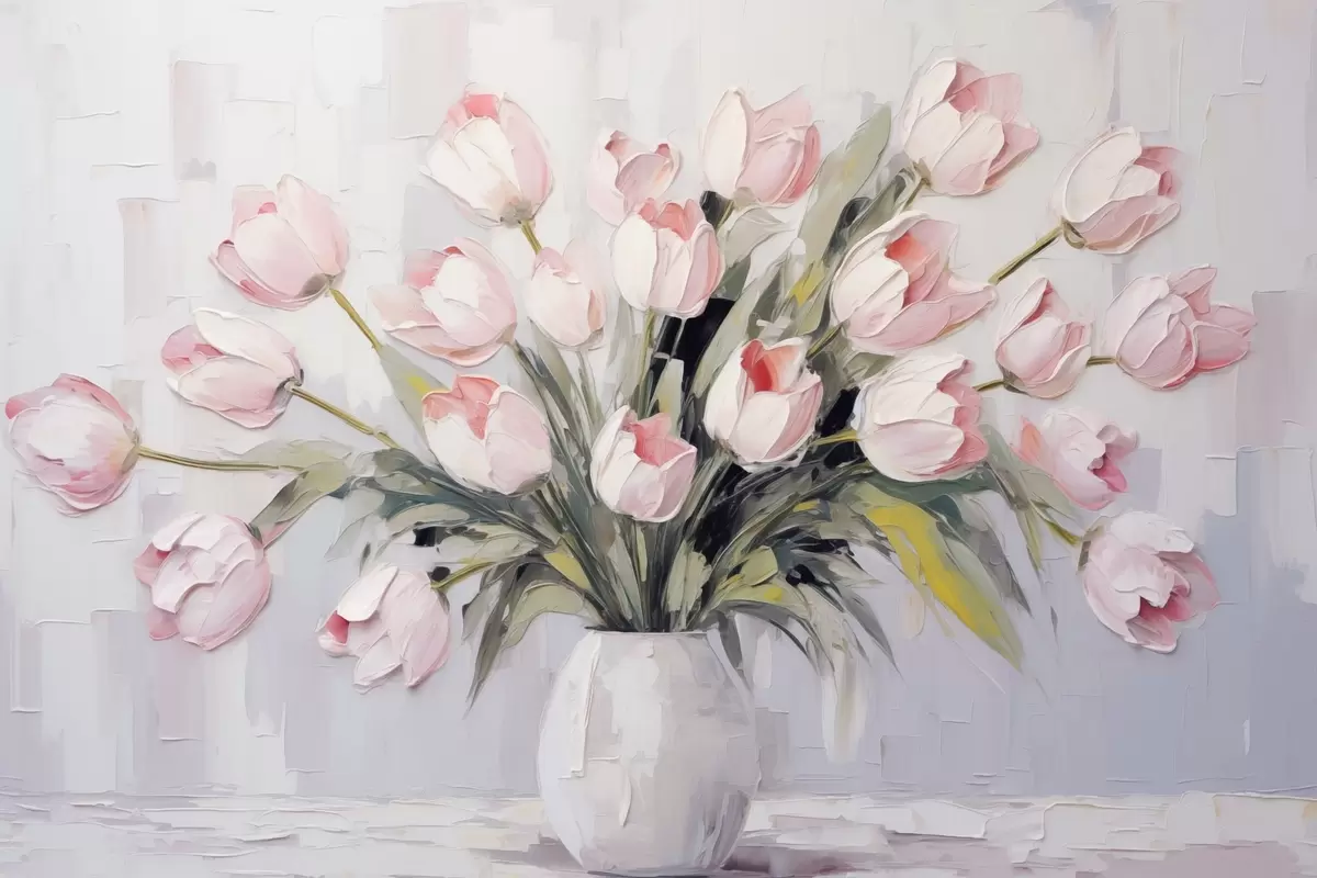 Schilderij Een vaas met roze tulpen, groene bladeren, lichtgrijze achtergrond , olieverfschilderij stijl, dikke penseelstreken Art. s44852