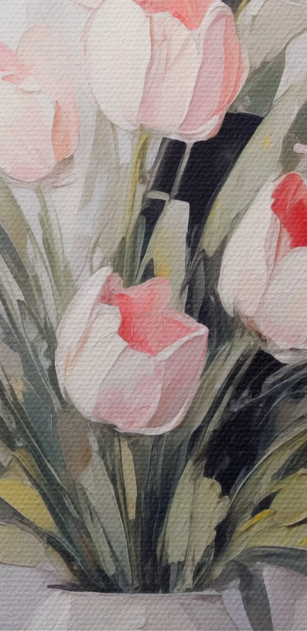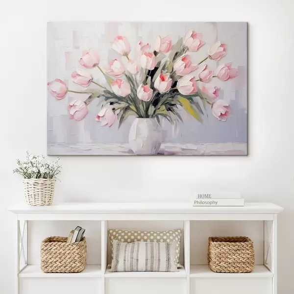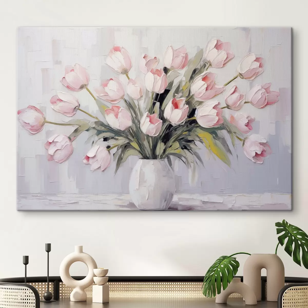 Schilderijen Een vaas met roze tulpen, groene bladeren, lichtgrijze achtergrond , olieverfschilderij stijl, dikke penseelstreken s44852