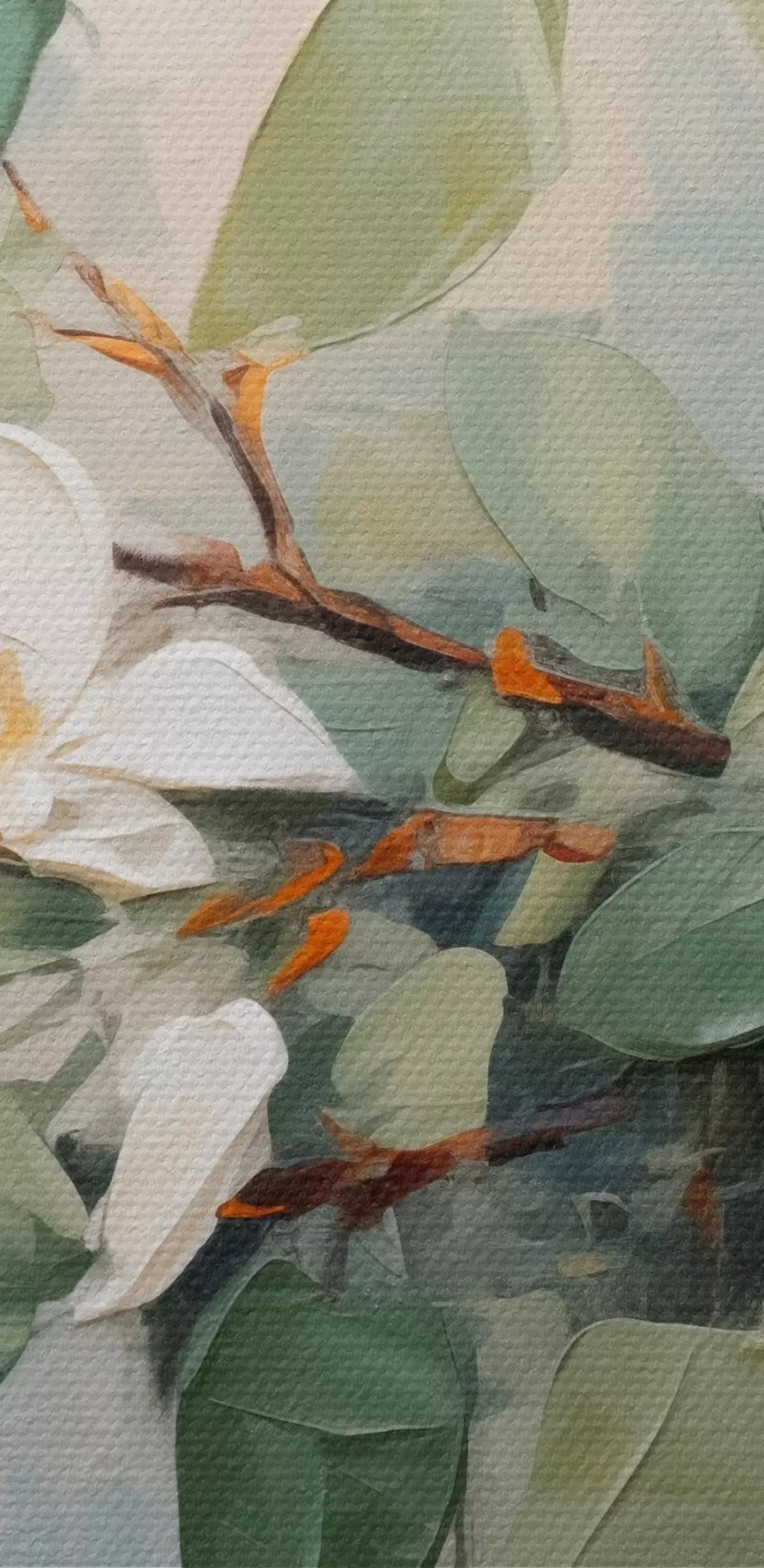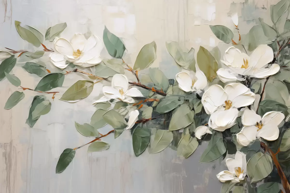 Schilderijen Magnolia bloemen met groene bladeren op een tak, impasto structuurstijl, zacht kleurenpalet s44853