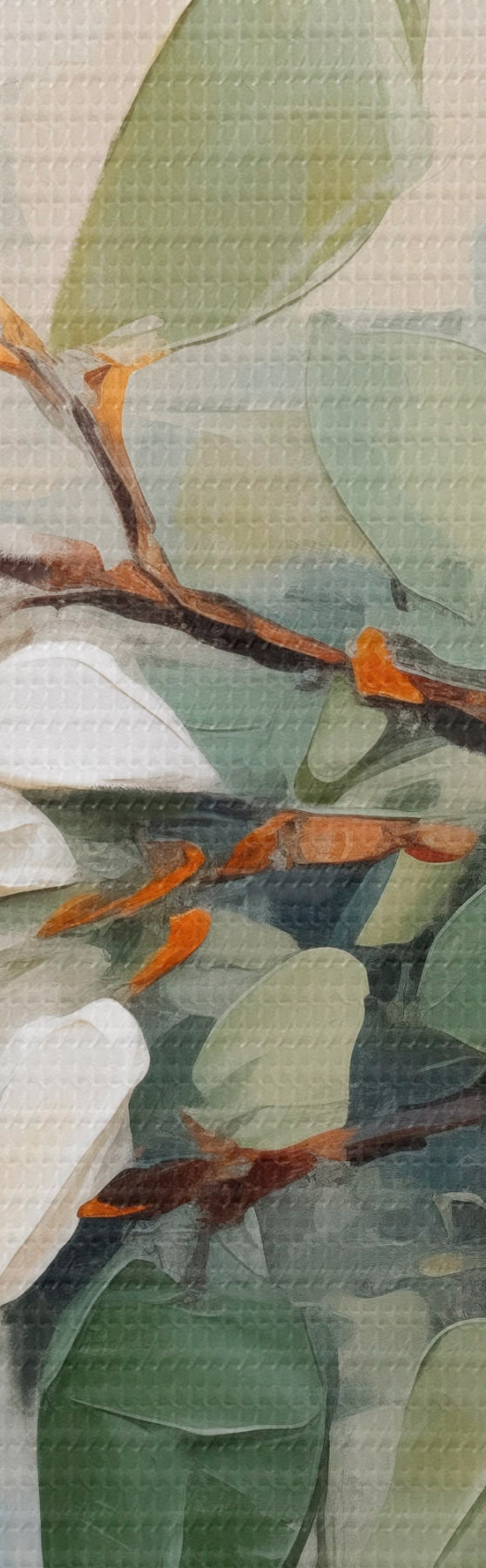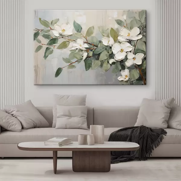Schilderij Magnolia bloemen met groene bladeren op een tak, impasto structuurstijl, zacht kleurenpalet Art. s44853