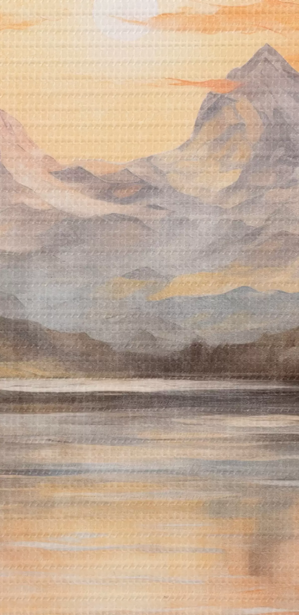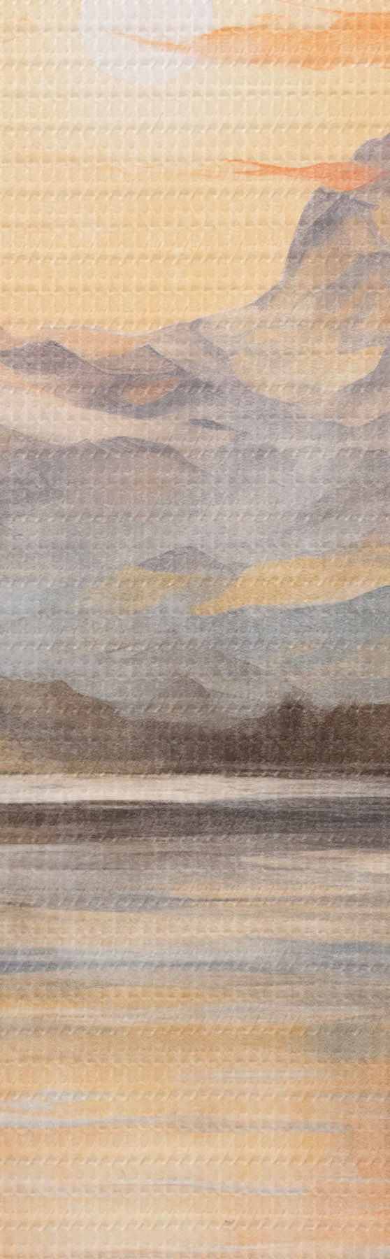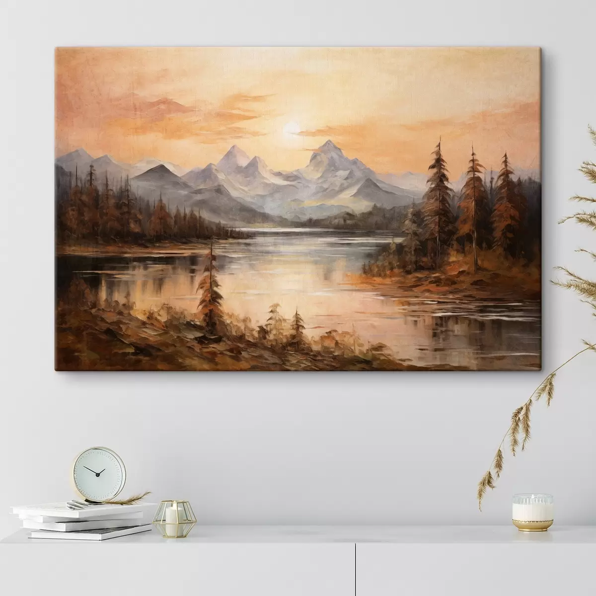 Schilderij Landschap met een meer omringd door bomen en bergen op de achtergrond, oranje lucht met de zon Art. s44857