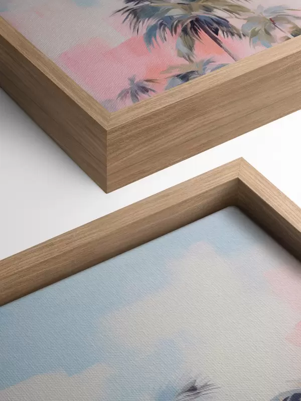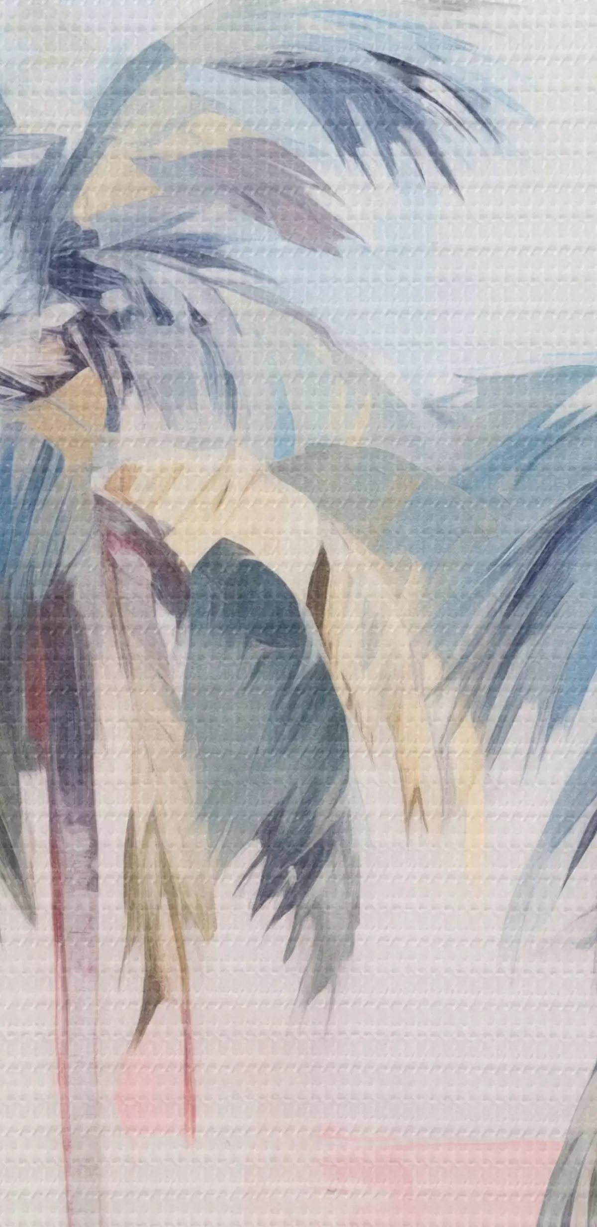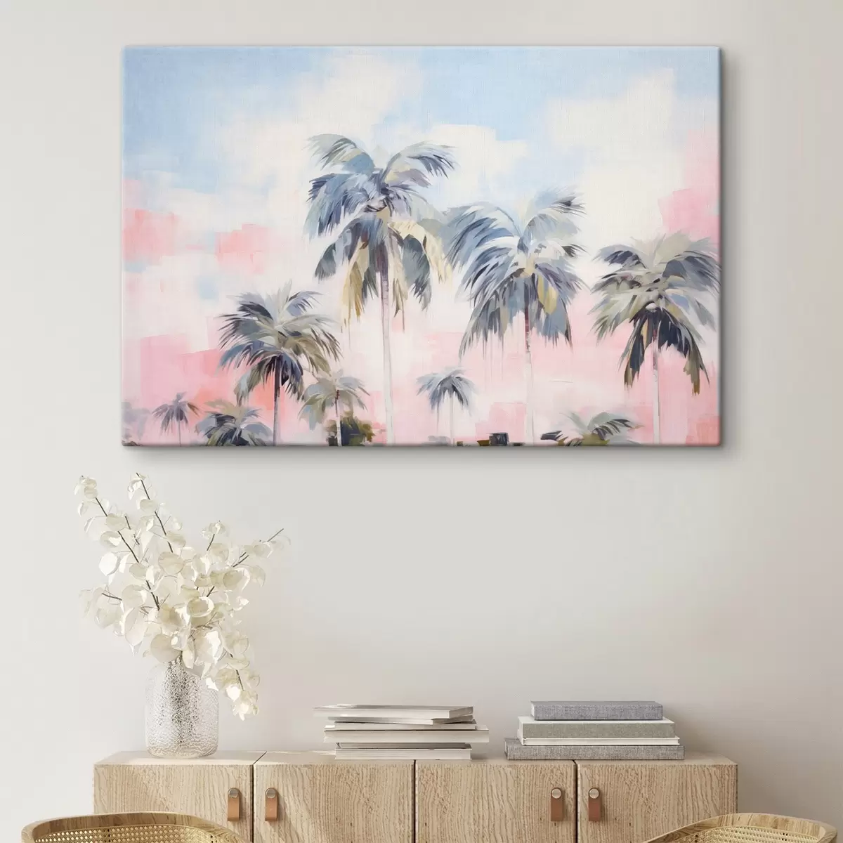 Schilderij Palmbomen met pastelkleurige bladeren en bruine stammen, roze en blauwe lucht, tropische omgeving Art. s44866