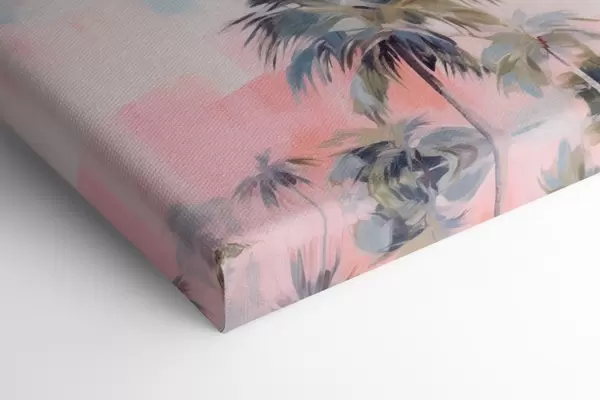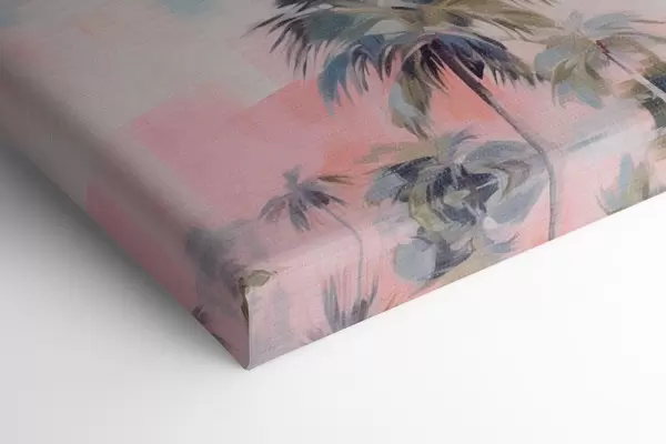 Schilderij Palmbomen met pastelkleurige bladeren en bruine stammen, roze en blauwe lucht, tropische omgeving Art. s44866