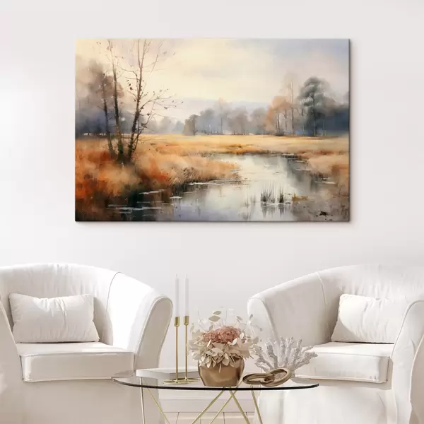 Schilderijen Een rustig landschapschilderij met textuur, imitatie van riet en kale bomen, het kalme water onder een hemel s44867