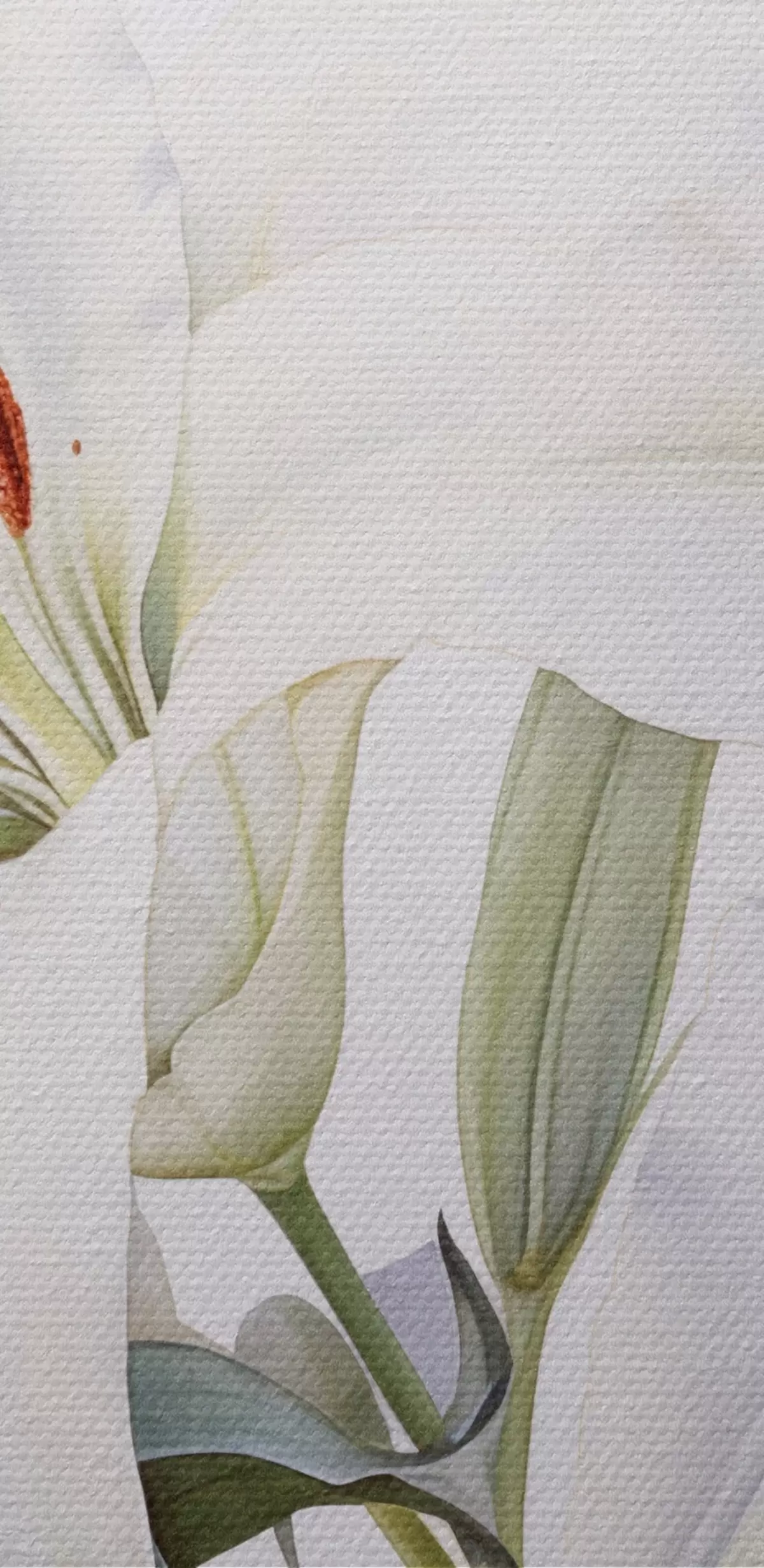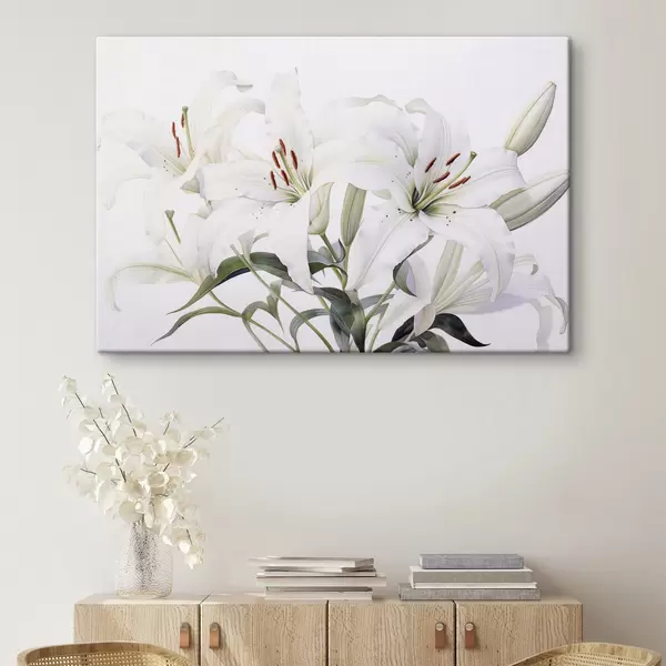 Schilderij Een boeket van witte lelies met groene bladeren, delicate bloemblaadjes en zachte witte achtergrond Art. s44868