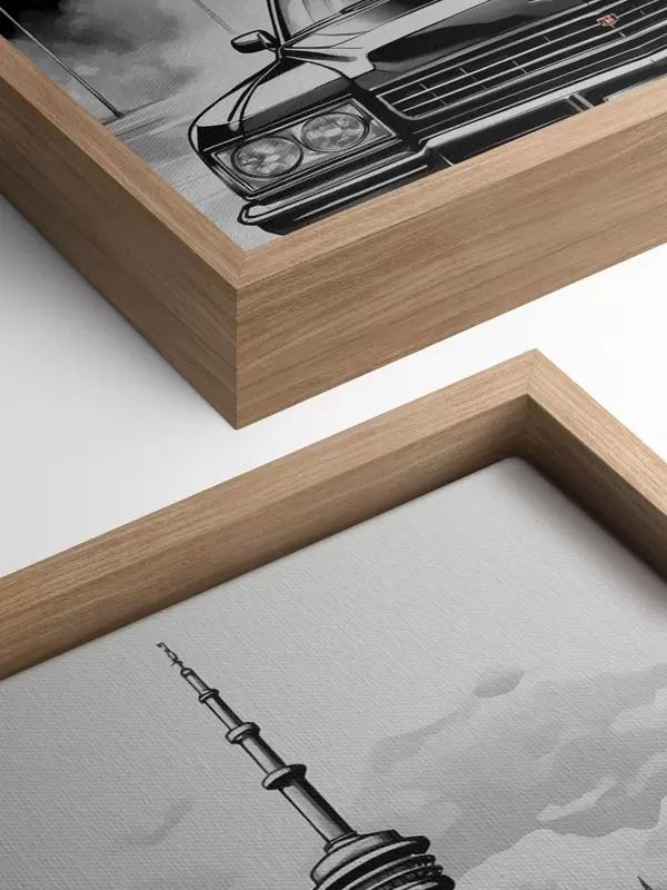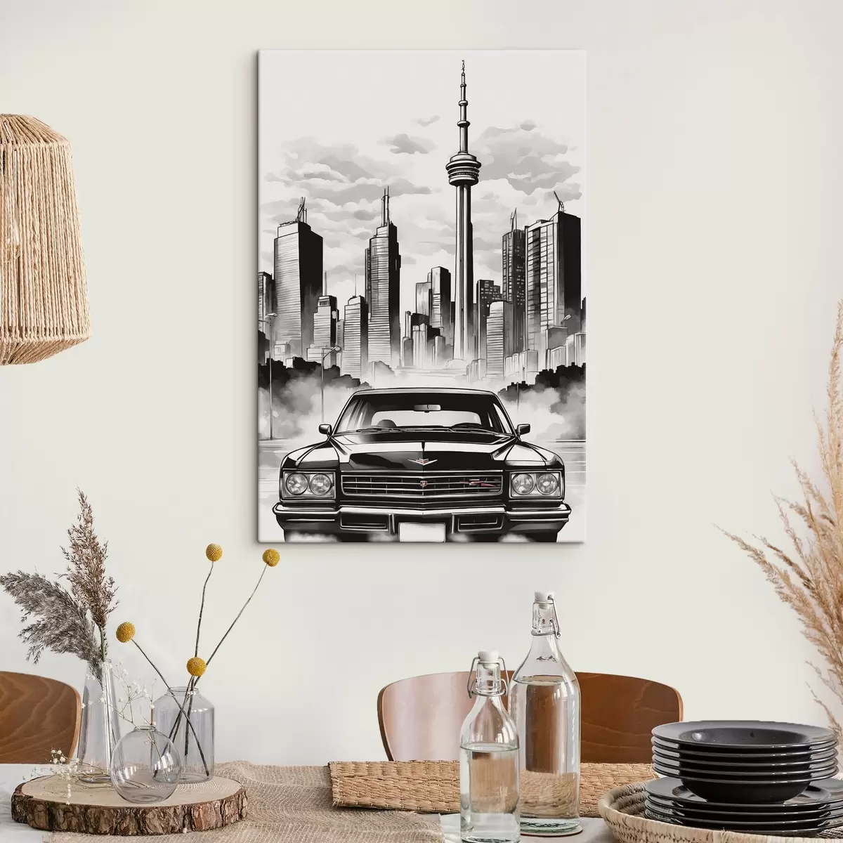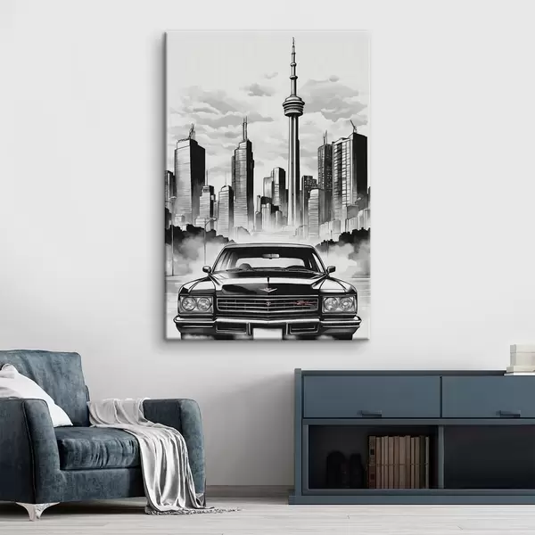 Schilderij Retro auto op de achtergrond van monochrome stad met wolkenkrabbers Art. s44871