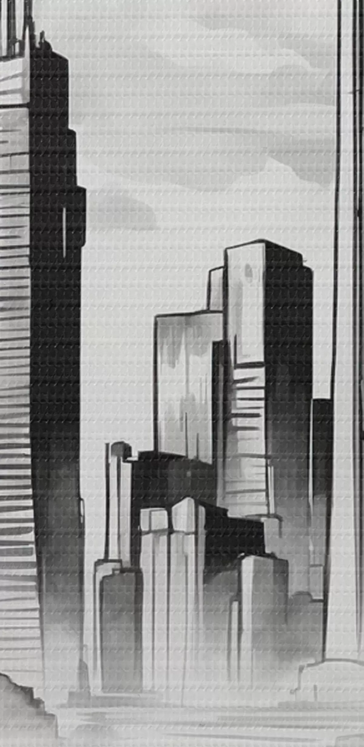 Schilderijen Retro auto op de achtergrond van monochrome stad met wolkenkrabbers s44871