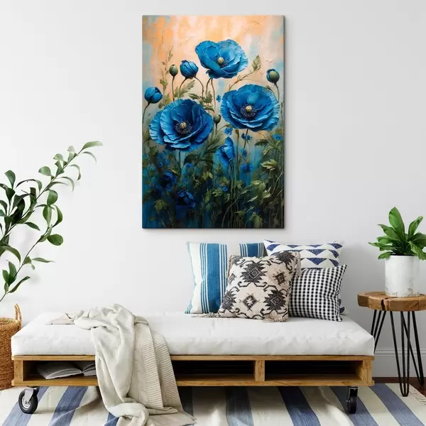 Schilderij Blauwe klaprozen op een pastelkleurige achtergrond met bladeren Art. s44882