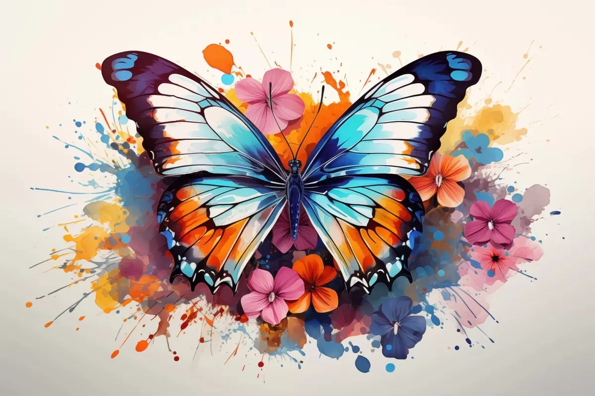 Schilderijen Dynamische compositie van een vlinder en bloemenvlekken in kunststijl s44943