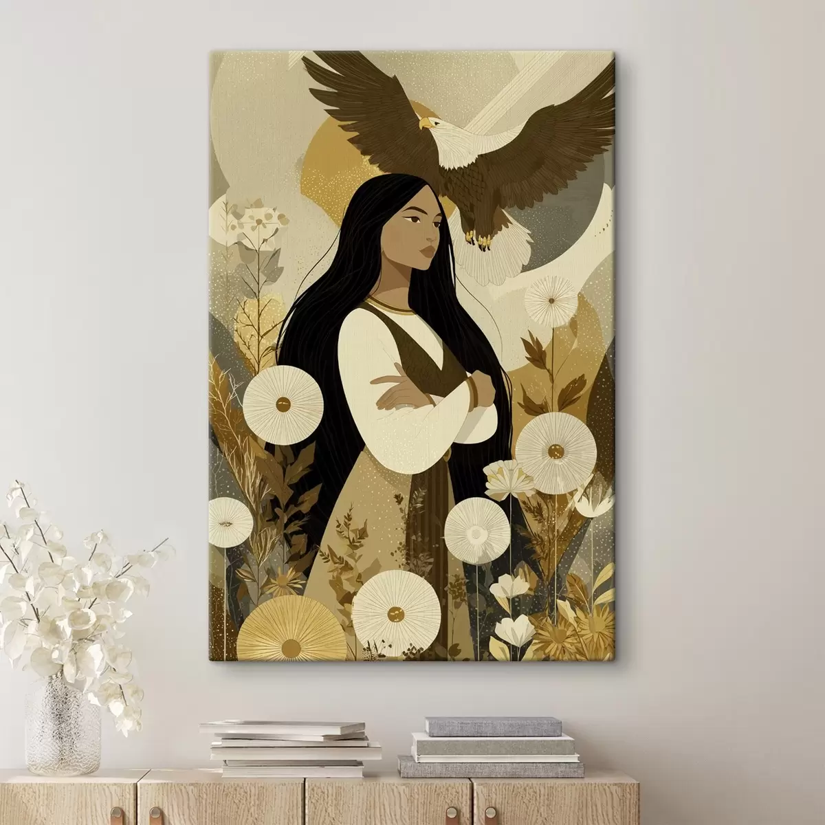 Schilderij Vrouw met vliegende adelaar, tribale stijl, beige kleuren Art. s44977