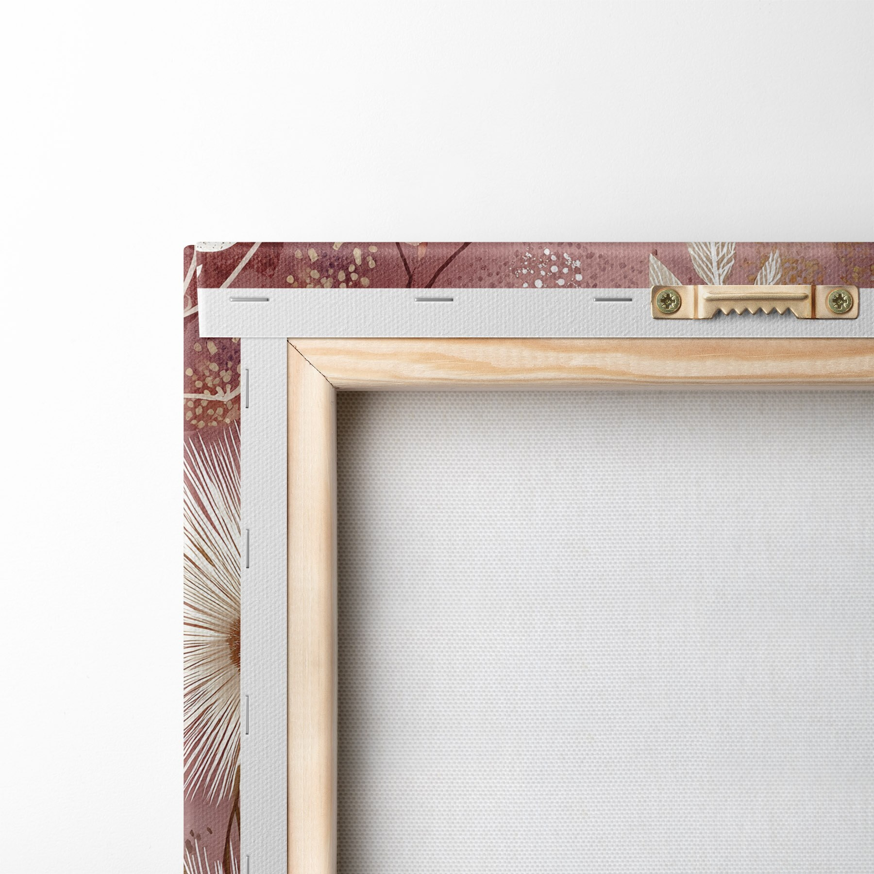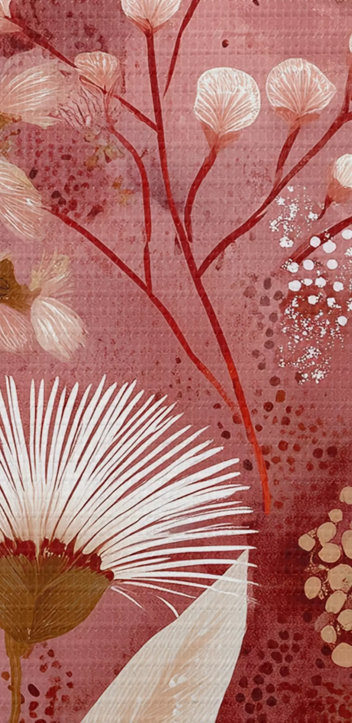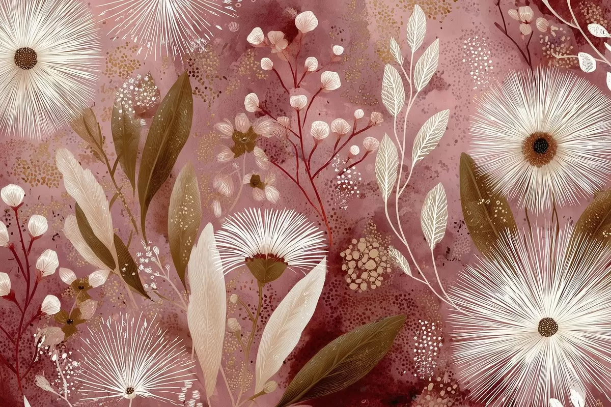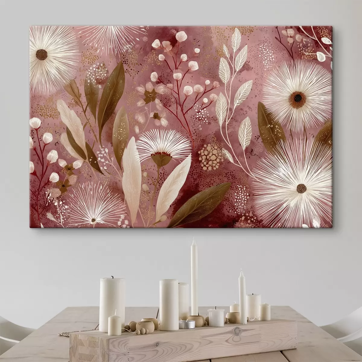 Schilderijen Boho stijl witte bloemen op de rode achtergrond, gedetailleerde tekening s44979