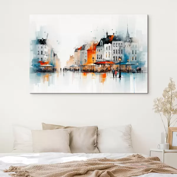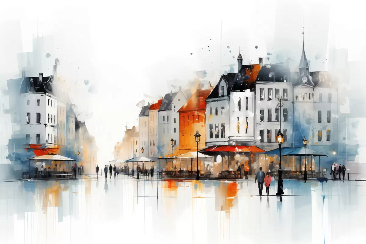 Schilderij Straatbeeld met gebouwen en mensen in artistieke stijl Art. s45050